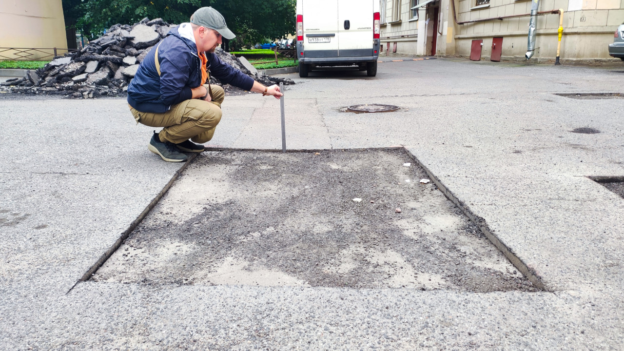 На изображении специалист проводит измерение глубины асфальтового слоя на квадратном участке выреза дорожного покрытия. Металлическая линейка используется для точной фиксации толщины слоя, предположительно после снятия верхнего фрагмента покрытия. На заднем плане видны фургон и здание с фасадом советской архитектуры, что указывает на проведение экспертизы во дворе старого жилого квартала. Фото документирует процесс строительного обследования, применяемого при контроле качества ремонта дорожных покрытий.