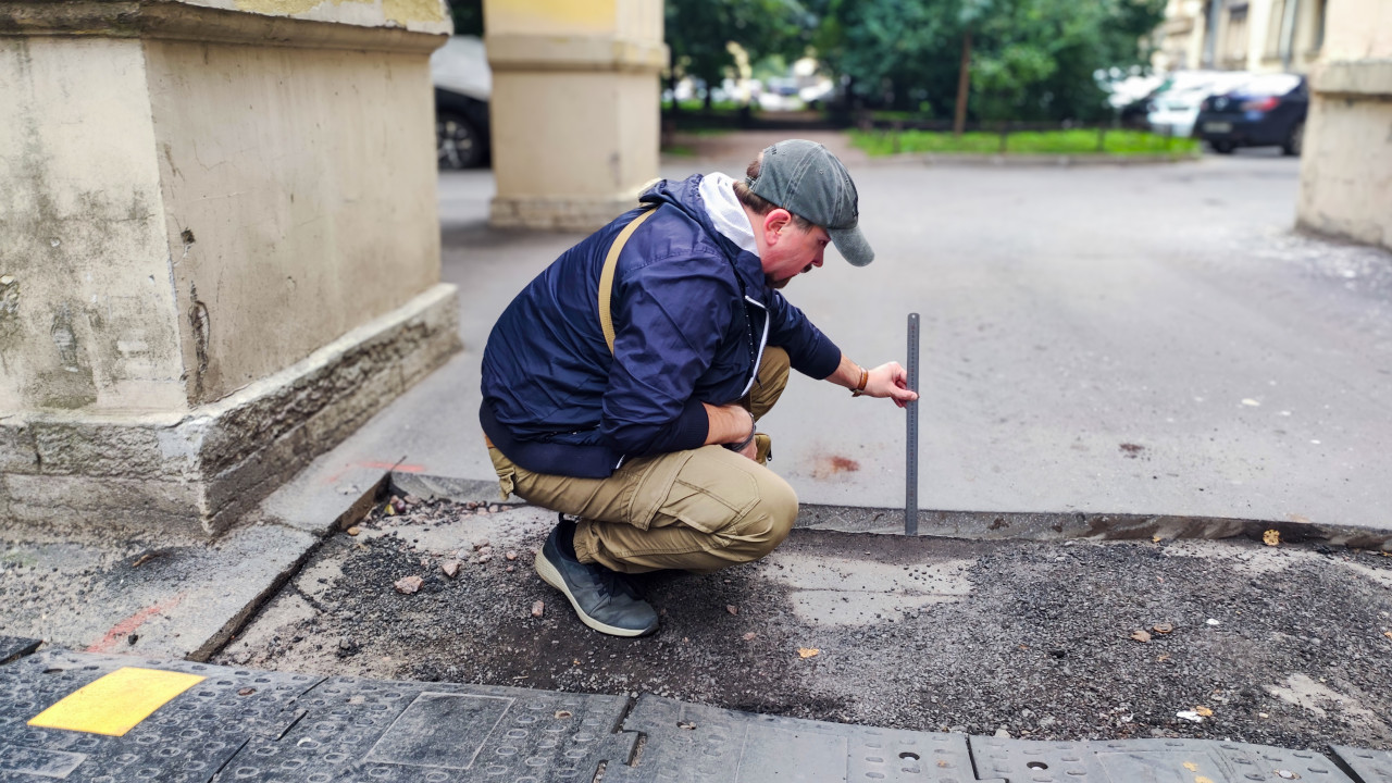 Специалист измеряет глубину снятого слоя асфальта у арки здания