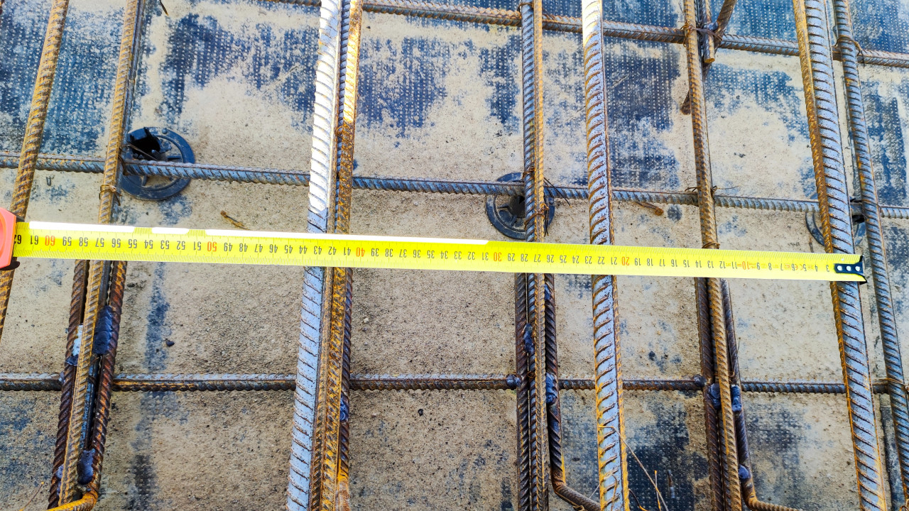 На фото показан процесс измерения шага арматуры с помощью строительной рулетки. Желтые цифры на ленте отчетливо видны, что подчеркивает точность фиксации данных. Арматурные стержни образуют сетку с регулярным шагом, между ними установлены пластиковые фиксаторы. Снимок отражает этап инженерного контроля на строительной площадке при подготовке к бетонированию. Фото может быть использовано в статьях о контроле качества, строительных стандартах, технологиях армирования и обучающих материалах по строительству.