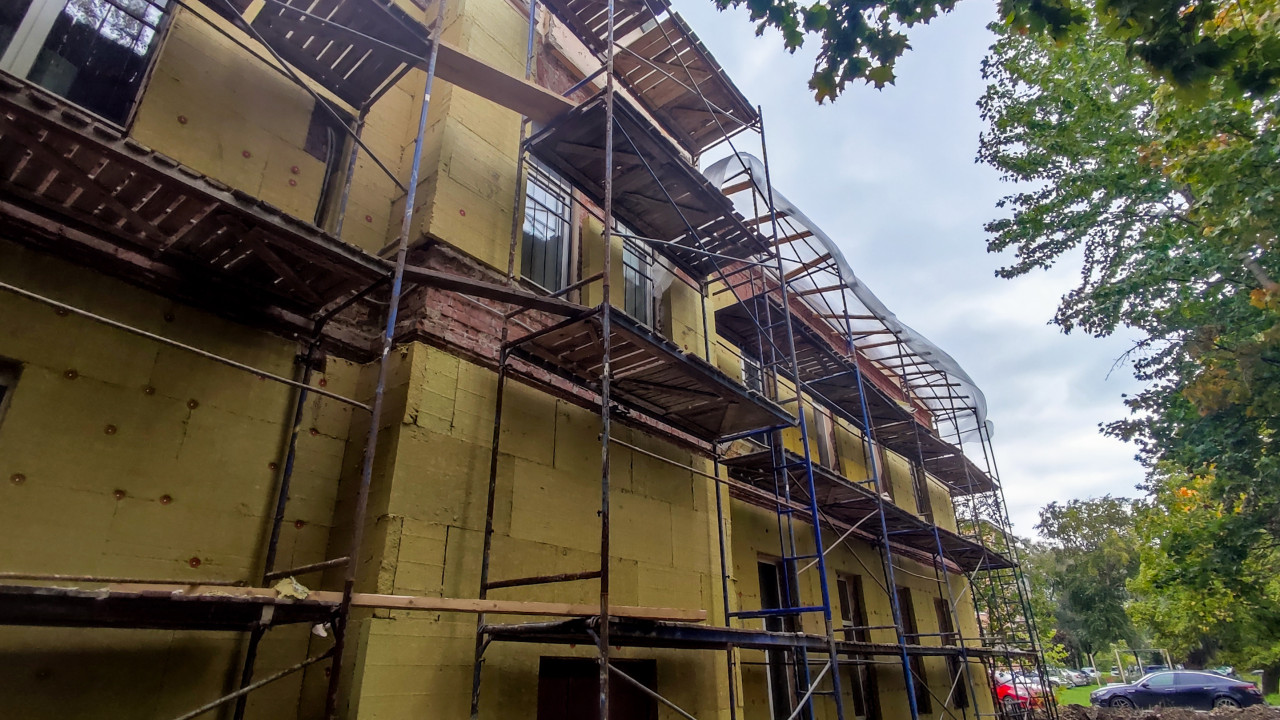 На фотографии показан процесс капитального ремонта старого кирпичного здания. На фасаде установлены строительные леса, видны закреплённые плиты теплоизоляции из минеральной ваты, зафиксированные дюбелями с красными шляпками. Часть стен остаётся без утепления, что указывает на промежуточный этап работ. Верх здания частично закрыт плёнкой для защиты от дождя. Сцена снята при дневном освещении, вероятно, в осенний период. Такое фото можно использовать для иллюстрации тем ремонта фасадов, энергоэффективной реконструкции и строительных технологий.