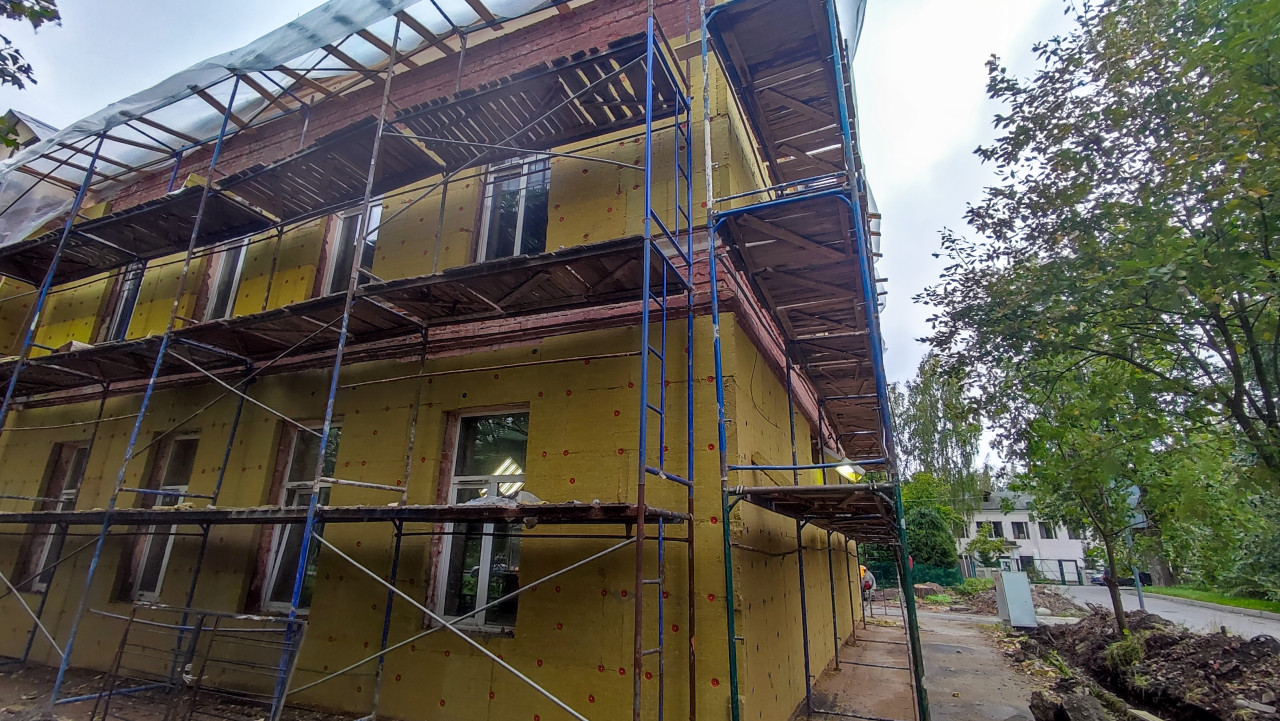 На снимке запечатлён угол двухэтажного кирпичного здания, покрытый плитами минеральной ваты для последующего нанесения фасадной отделки. Установлены металлические строительные леса, на которых ведутся работы по утеплению. Видно, что стены закреплены специальными фасадными дюбелями. На переднем плане проходит дорожка и участок раскопки вдоль здания, вероятно, для замены инженерных коммуникаций. Фотография отражает процесс комплексной реконструкции с утеплением фасада и благоустройством прилегающей территории.