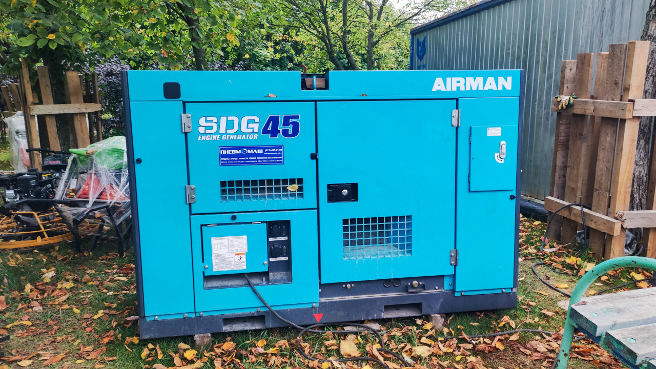 На снимке изображён передвижной генератор марки Airman SDG45 — оборудование, используемое для автономного электроснабжения строительных объектов. Генератор имеет характерный голубой корпус и установлен рядом со строительным контейнером и оборудованием. На заднем плане — деревья и складированные материалы. Фотография может применяться в материалах по строительной технике, энергетическому обеспечению площадок и инвентаризации оборудования.