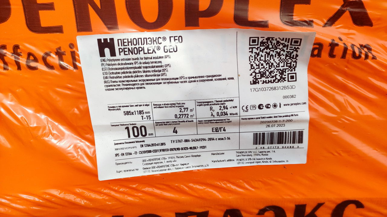 Фотография показывает крупным планом этикетку на упаковке утеплителя «Пеноплэкс GEO». На ярко-оранжевой плёнке видны технические характеристики материала, включая толщину плит 100 мм, коэффициент теплопроводности и дату производства. Указаны производственные данные завода в Ленинградской области. Изображение подходит для иллюстрации документации по строительным материалам, обзоров теплоизоляции и проектных решений в строительстве.