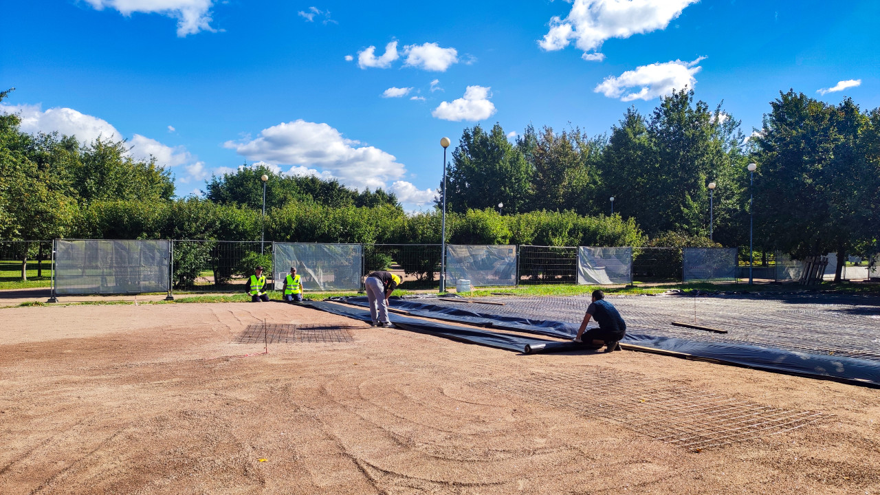 На фото изображены рабочие в сигнальных жилетах, которые раскатывают рулон геотекстиля на участке с щебёночным основанием. На заднем плане видны ограждения и деревья парковой зоны. Сцена отражает этап подготовки территории к последующей укладке покрытия в рамках благоустройства общественного пространства.