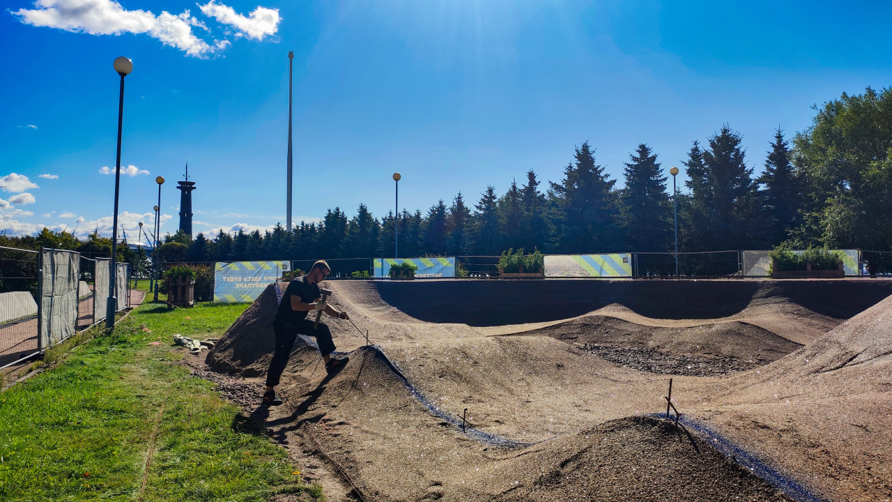 Рабочий проверяет уклон трассы памп-трека в парке 300-летия Санкт-Петербурга