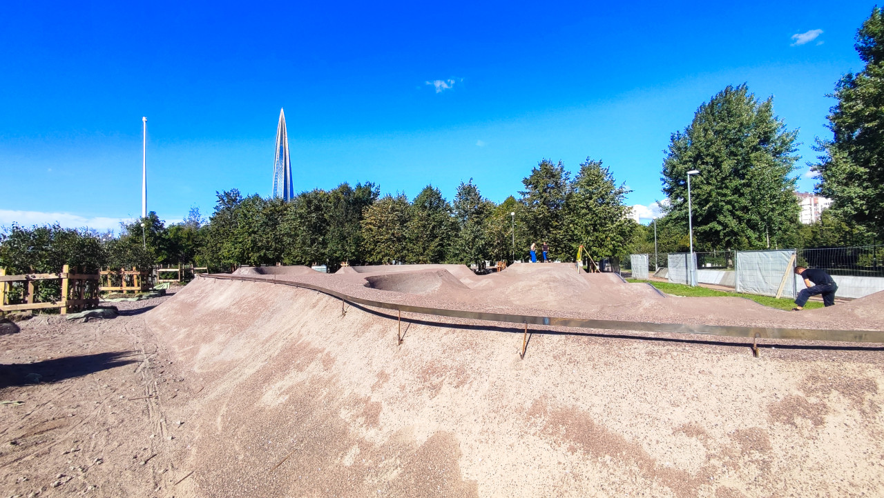 На снимке показан участок строительства спортивно-досугового объекта в парке 300-летия Санкт-Петербурга. Формируется рельеф трассы памп-трека — волнообразной площадки для катания на велосипедах. На горизонте отчётливо виден шпиль небоскрёба «Лахта-центр», завершённого в 2019 году и являющегося самым высоким зданием России и Европы. На переднем плане видны насыпи из щебня, металлические направляющие и временные ограждения. Рабочие проводят выравнивание профиля трассы. Снимок документирует процесс благоустройства и строительства современной спортивной инфраструктуры в приморской части города.