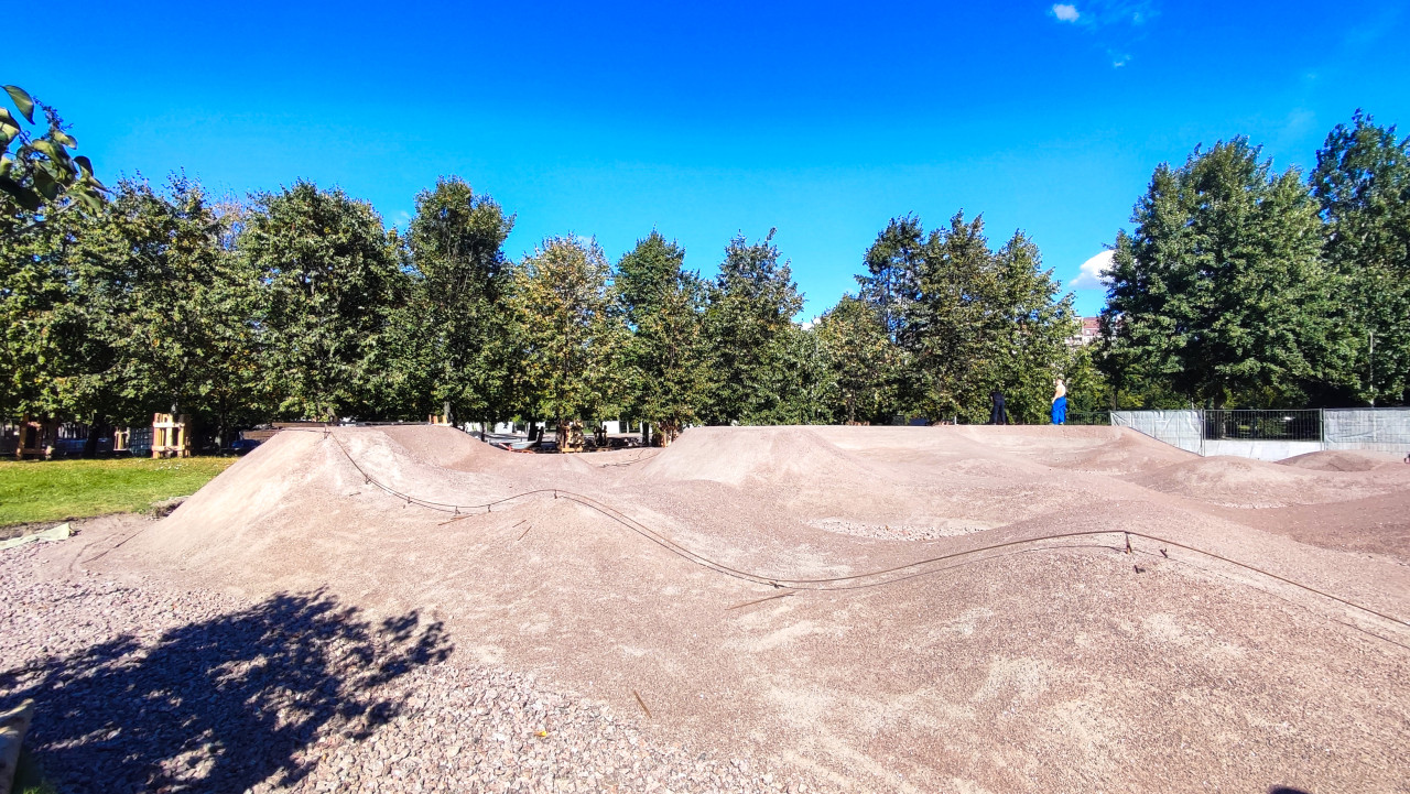 На снимке изображён процесс уплотнения и профилирования основания трассы памп-трека, строящегося в парке 300-летия Санкт-Петербурга. Поверхность площадки состоит из слоя щебня, по которому проходят инженерные разметки и направляющие, формирующие волнообразный рельеф. На фоне видна зелёная зона и элементы благоустройства территории. Работы выполняются при ясной погоде, что подчёркивает летний этап строительства. Фотография иллюстрирует стадию подготовки основания под финишное покрытие трассы, демонстрируя технологию создания спортивных площадок.