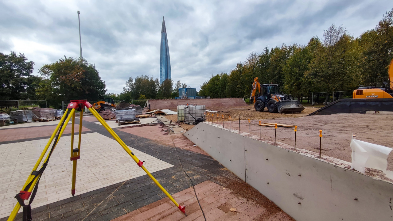 На снимке показана строительная площадка в Санкт-Петербурге, на фоне которой возвышается башня «Лахта-центр» — одно из самых высоких зданий Европы. На переднем плане установлен жёлтый штатив геодезического прибора, а также видна спецтехника: экскаваторы и погрузчики, работающие на выравнивании песчаного основания. На площадке размещены паллеты с материалами, бетонные конструкции и ёмкости с водой. Снимок отражает современный этап благоустройства и строительства общественного пространства в прибрежной зоне города. Может применяться в архитектурных публикациях, инженерных отчётах и презентациях строительных компаний.