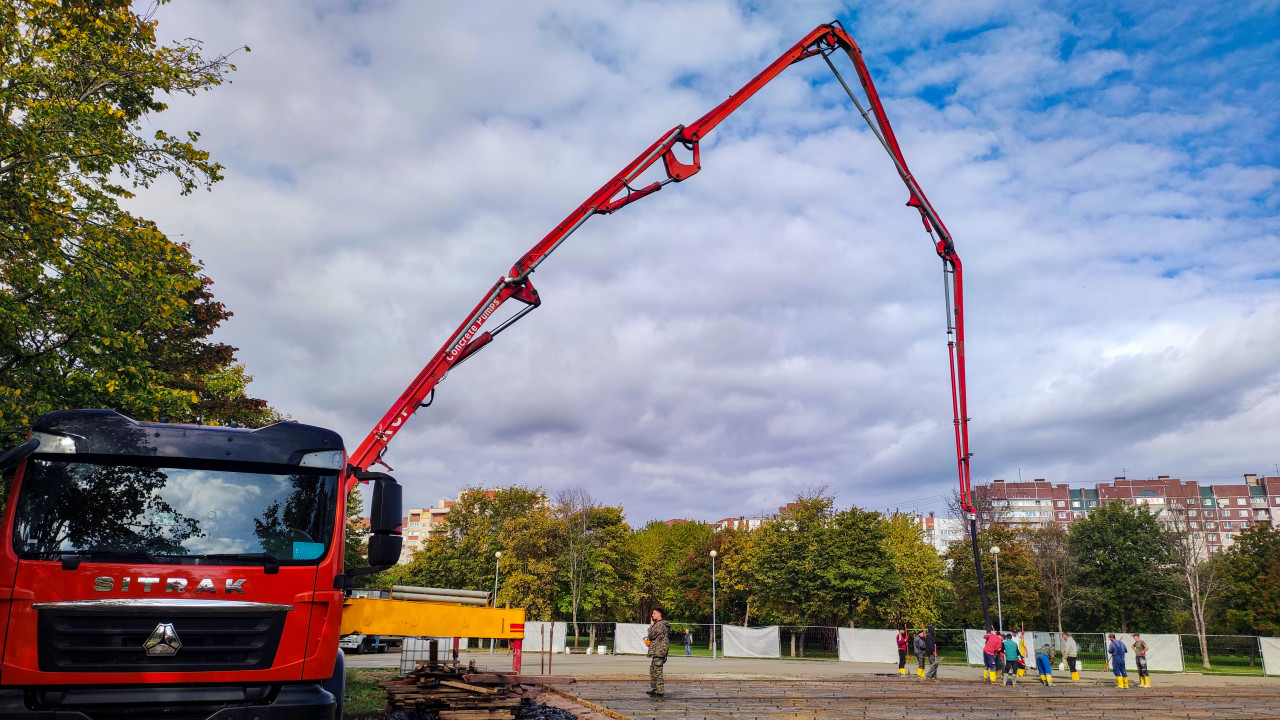 На фотографии крупным планом виден бетонный насос с ярко-красной стрелой, подающий смесь на армированную площадку. Рядом находится бетономешалка Sitrak, обеспечивающая подачу раствора. Рабочие распределяют бетон по поверхности, а вдалеке видны деревья и многоэтажные жилые здания. Снимок отражает современные технологии бетонных работ в городской среде, где используются мобильные насосы и транспорт для механизированной подачи.
