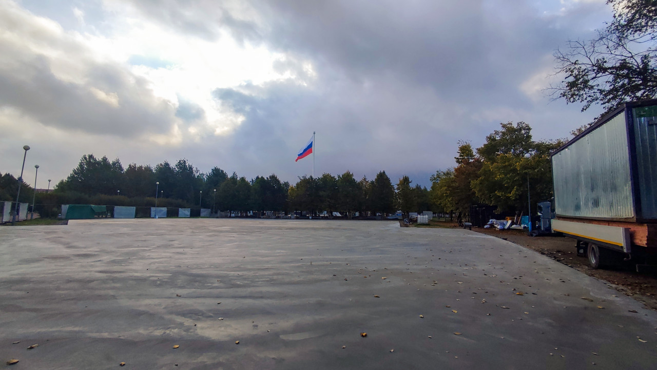 Фотография демонстрирует обширную вымощенную площадь с установленным на высоком мачтовом флагштоке флагом Российской Федерации. На правом краю кадра виден строительный вагончик и временные сооружения, что свидетельствует о продолжающихся работах по благоустройству. Небо затянуто облаками, освещение мягкое, что типично для северных регионов осенью. Снимок подходит для публикаций, связанных с реконструкцией общественных пространств, развитием городской инфраструктуры и благоустройством парков и площадей.