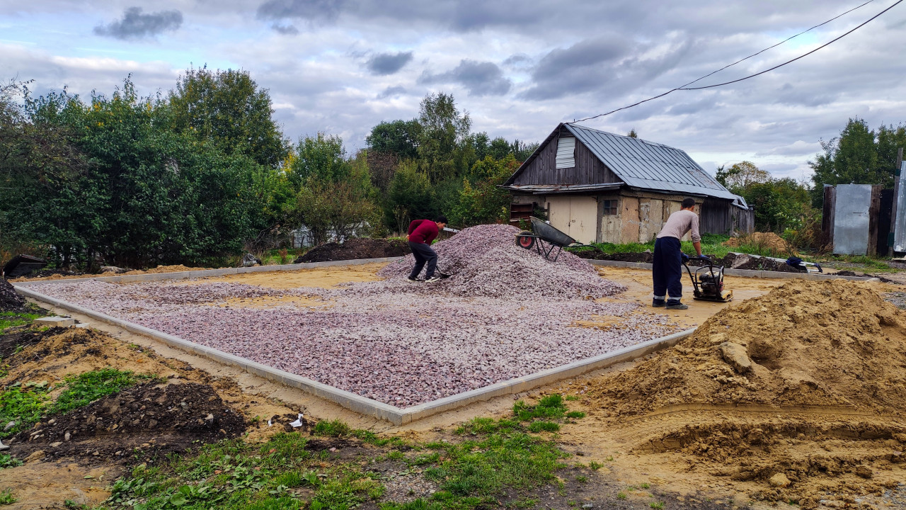 строительная площадка стройка стройплощадка строительный участок строительство строительные работы основание фундамент щебень песок ручная работа трамбовка виброплита рабочие частное строительство участок коттедж дача инженерные работы выравнивание борт бетон инструменты подготовка основания загород благоустройство застройка сельская местность дренаж земляные работы ручной труд строительные материалы уровень площадкаПохожие фотографии