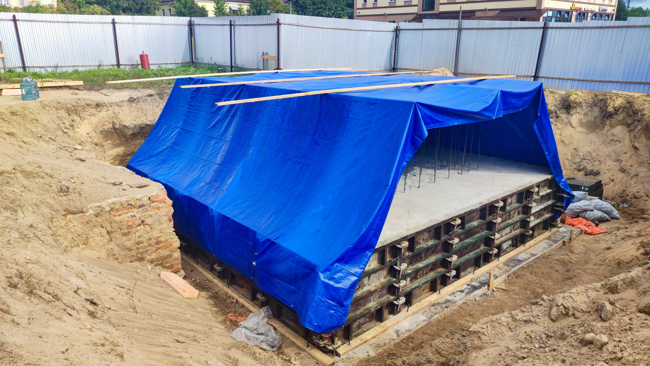 строительство фундамент строительная площадка бетон армирование тент защита бетонная плита арматура опалубка монолит строительные технологии инженерные работы подрядчик Россия строительный процесс технология бетонирования гидроизоляция временное укрытие строительные материалы подготовка основания бетонные конструкции инженерия дренаж строительные этапы архитектураПохожие фотографии