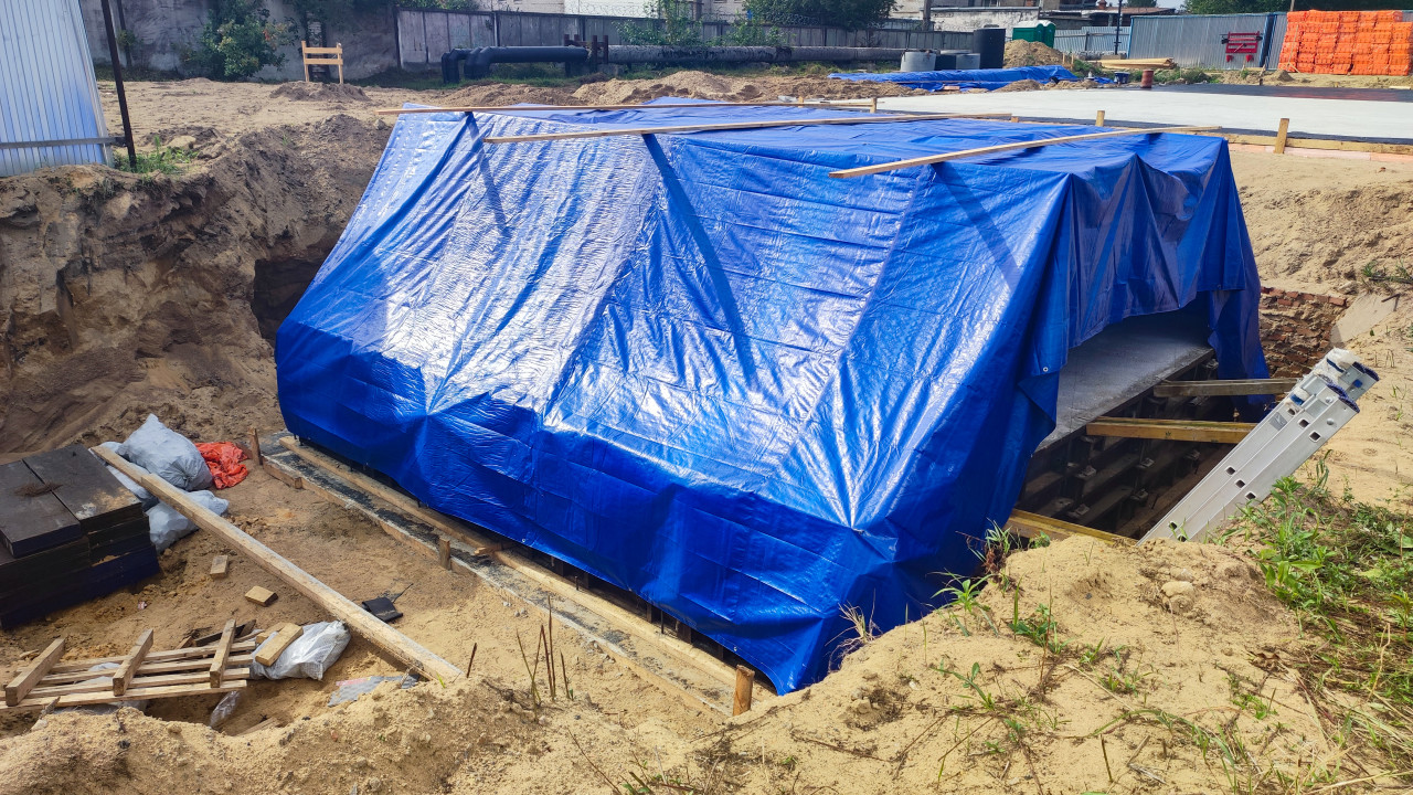 На фото показан котлован с бетонным сооружением, укрытым синим тентом. Тент закреплён деревянными рейками, а вокруг видны остатки старой кирпичной кладки, инструменты и мешки со строительными материалами. Поверхность бетонной плиты находится в опалубке, что указывает на ранний этап строительства — выдержку бетона в процессе набора прочности. Снимок отражает реальные условия строительных работ и применяемые методы защиты конструкций от осадков и температурных перепадов.