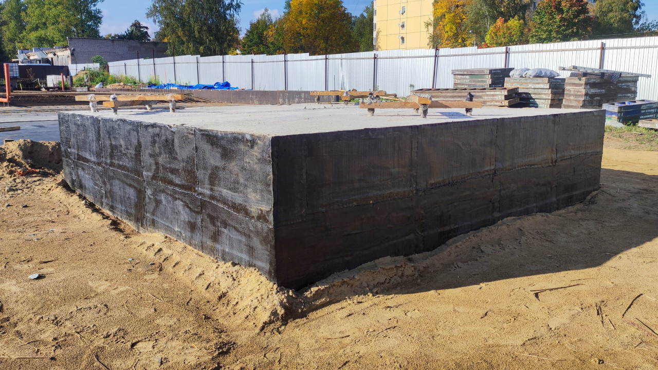 Гидроизоляция бетонного основания здания на строительной площадке