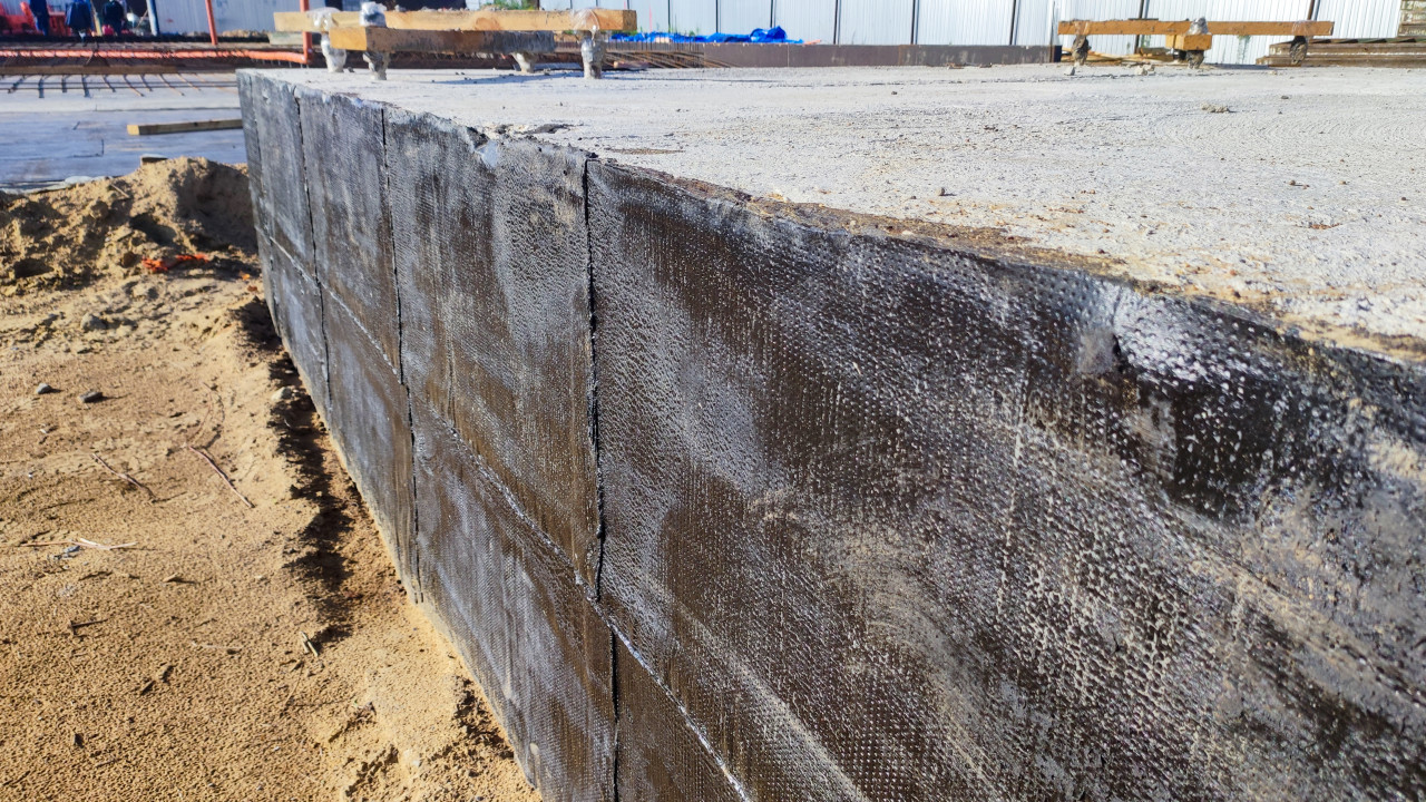 строительство фундамент строительная площадка гидроизоляция битумная мастика рулонная изоляция бетон защита фундамента стыки изоляции крупный план строительные технологии гидроизоляционные материалы строительный контроль инженерные работы защита от влаги битум монолитное основание наружные работы строительные стандарты строительная экспертиза строительные дефекты качество работ изоляционные швы фундаментные конструкции Россия строительный процесс поверхность бетона битумное покрытие контроль качества строительная инспекция изоляция швовПохожие фотографии