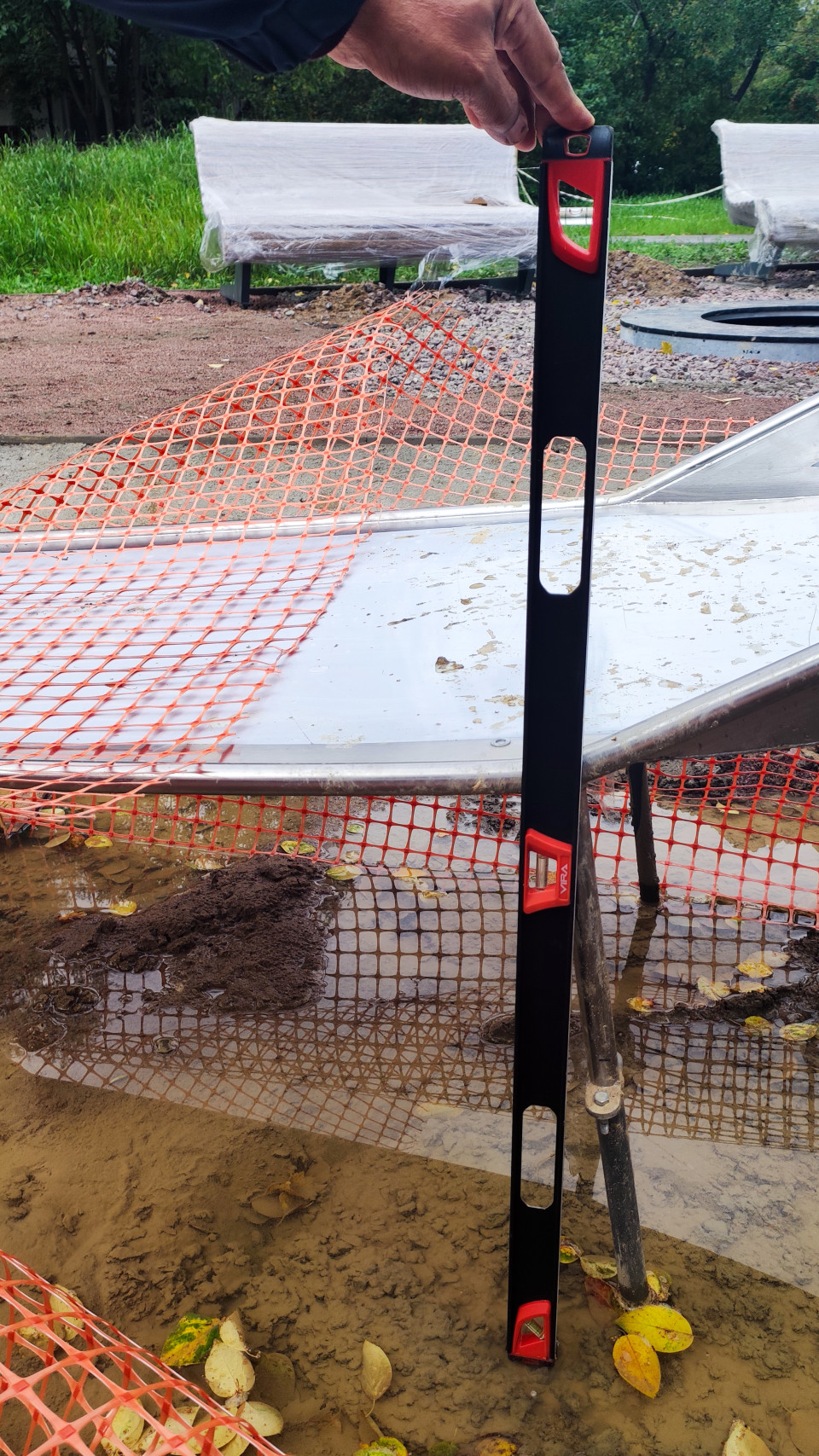 На снимке запечатлён процесс проверки уклона установленной металлической горки с помощью строительного уровня. Работы выполняются на благоустраиваемой территории, где видны свежий грунт, лужи после дождя и временные ограждения из оранжевой сетки. На заднем плане — скамейки, обёрнутые защитной плёнкой, и зелёные насаждения. Фото иллюстрирует этап технического контроля и измерений при монтаже детского игрового оборудования. Материал может использоваться в отчётности по строительным проектам, обучающих материалах и публикациях о стандартах безопасности.