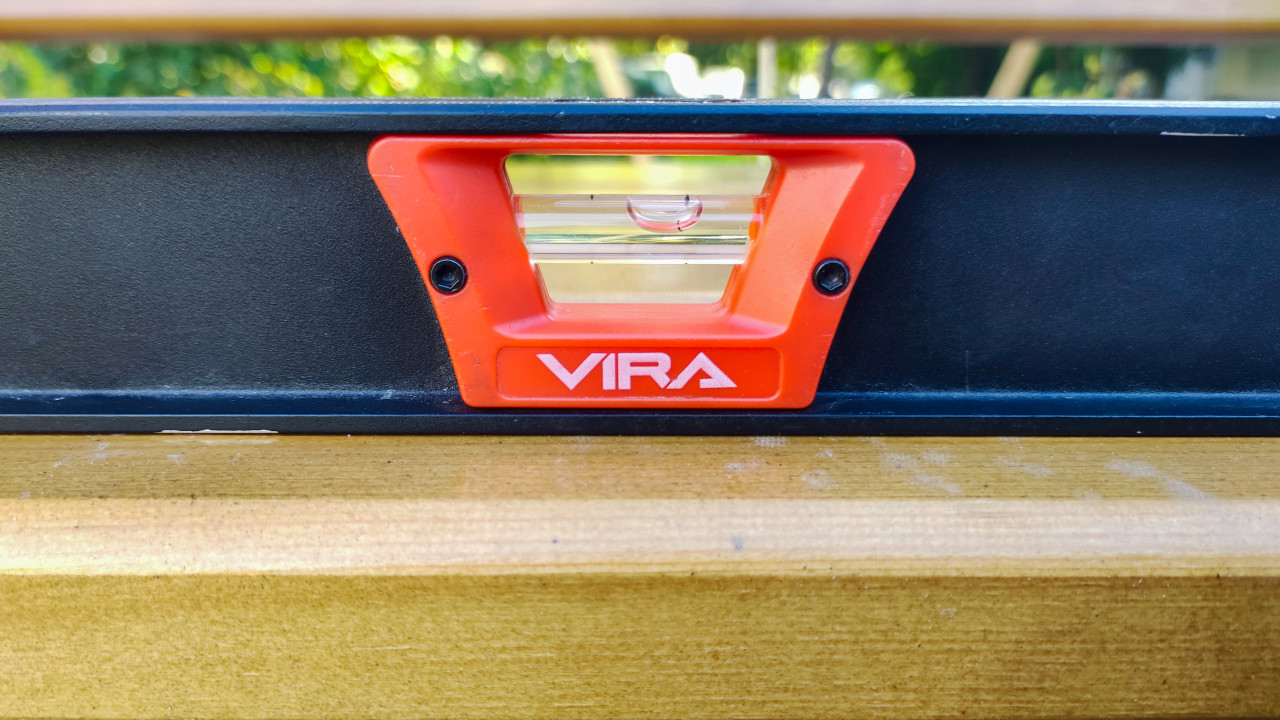 На изображении зафиксирован момент проверки уровня поверхности с помощью строительного уровня VIRA. Инструмент установлен на горизонтальной деревянной панели, а фокус направлен на измерительное окошко с жидкостью и пузырьком. Фон размыт и включает зелёные деревья и солнечный свет. Сцена отражает применение стандартных методов контроля точности при монтаже архитектурных элементов.