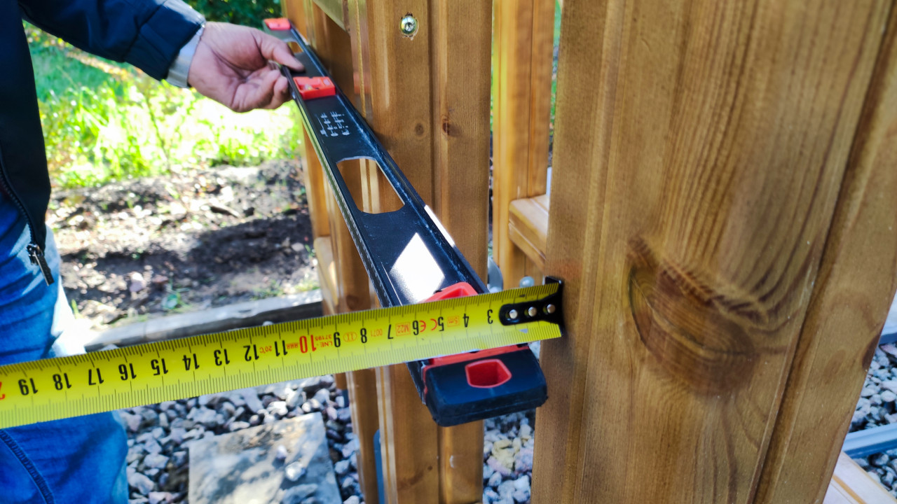 На фотографии показан процесс измерения расстояния между стойками деревянной конструкции с использованием рулетки и строительного уровня. Рабочий фиксирует точные размеры при помощи двух инструментов, контролируя точность сборки. На фоне видны гравийная подсыпка и зелёные насаждения. Фото отражает этап инженерных измерений и контроля геометрии малых архитектурных форм.