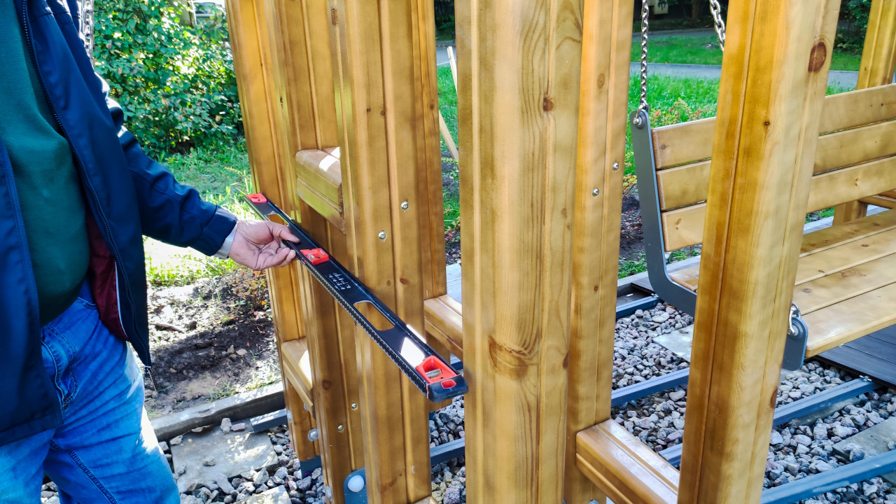 На фото изображён человек, выполняющий проверку вертикальности и горизонтальности деревянных стоек с помощью строительного уровня. Конструкция представляет собой уличную архитектурную форму с подвесными элементами. Рабочий использует инструмент VIRA для точного контроля сборки. На фоне виден участок благоустройства с гравийным основанием и зеленью. Снимок иллюстрирует технический надзор при монтаже элементов городской среды.