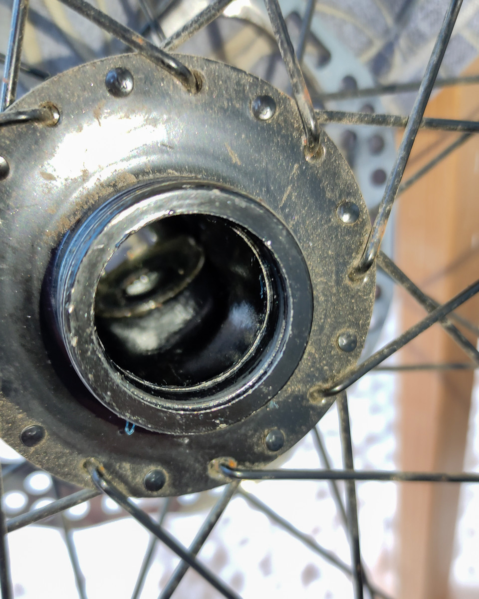 На фото показана втулка велосипедного колеса вблизи. Видны металлические спицы, обод и корпус втулки с резьбой. Поверхность имеет следы эксплуатации и пыль, что говорит об использовании детали. Снимок можно использовать в материалах о ремонте, техобслуживании велосипедов, а также для технических публикаций.