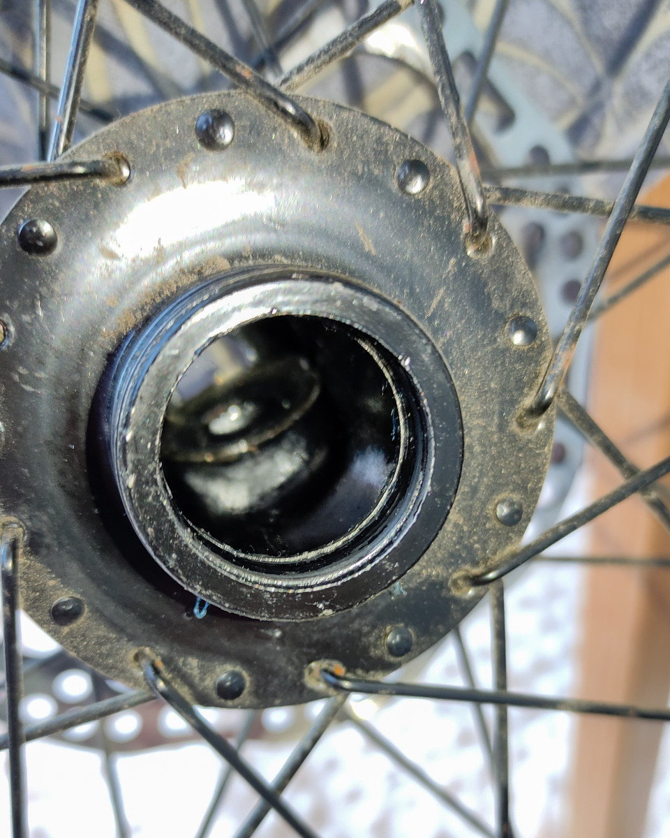 На фото запечатлена втулка велосипедного колеса вблизи. Хорошо видны металлические спицы, часть тормозного диска и корпус втулки с резьбовым соединением. Поверхность детали покрыта пылью и следами эксплуатации. Снимок может использоваться в технических материалах о конструкции велосипедов, их ремонте и обслуживании.