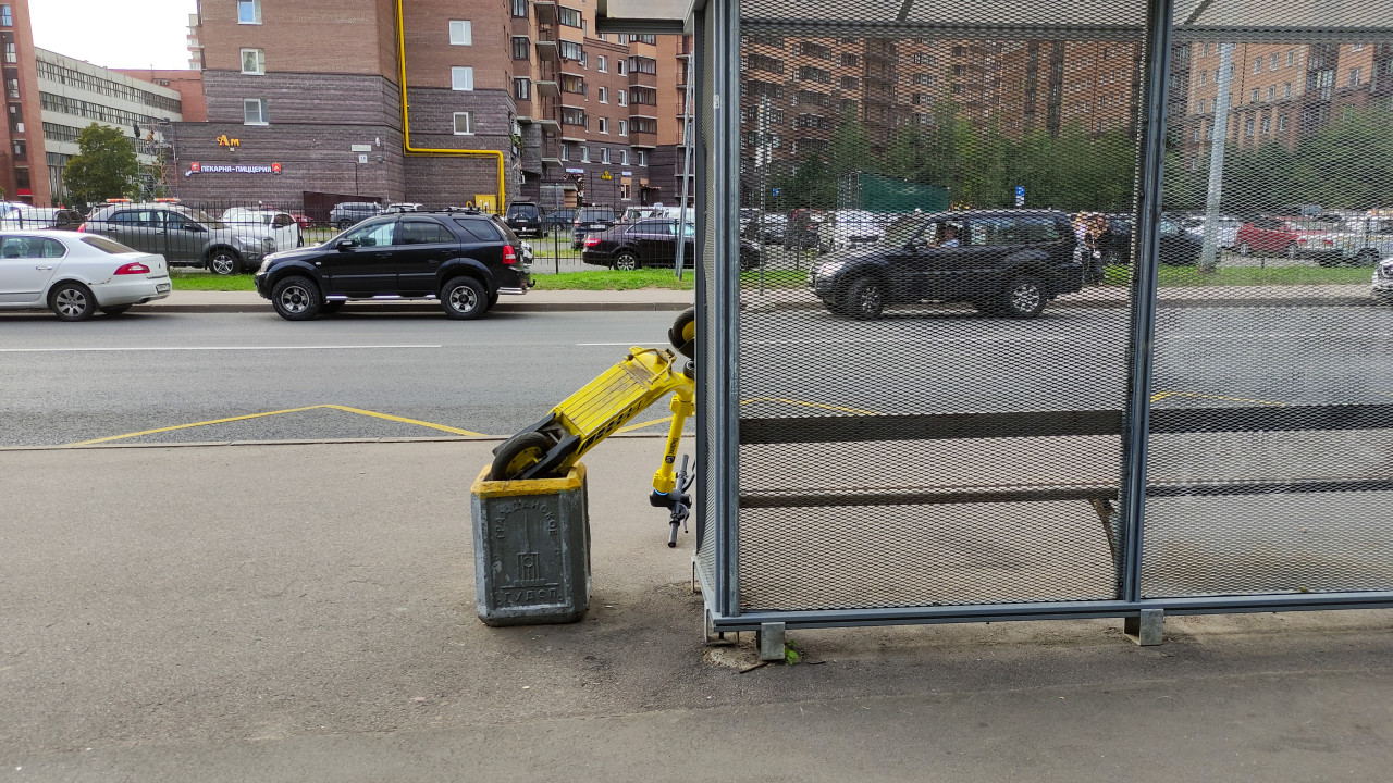 На фотографии изображен жёлтый электросамокат, который кто-то поместил в бетонную урну рядом с остановочным павильоном. Транспортное средство стоит под углом, колесо зафиксировано в урне, что создаёт необычную и абсурдную городскую сцену. На заднем плане видны припаркованные автомобили, многоэтажные жилые дома и элементы уличной инфраструктуры, включая проезжую часть и фасады современных зданий. Снимок иллюстрирует проблемы несанкционированного размещения самокатов и особенности городской среды.