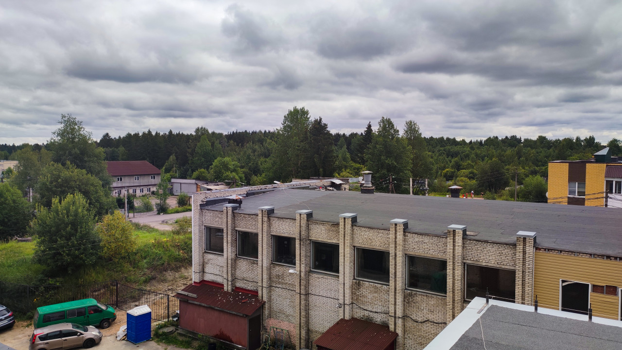 На фотографии показано двухэтажное кирпичное здание с плоской крышей, покрытой рулонным материалом. На переднем плане видны автомобили и хозяйственные постройки, на заднем плане — густой лесной массив. Состояние здания отражает особенности советской и постсоветской застройки в промышленных или складских районах. Снимок может использоваться в материалах о городской архитектуре, строительстве и инфраструктуре малых городов.