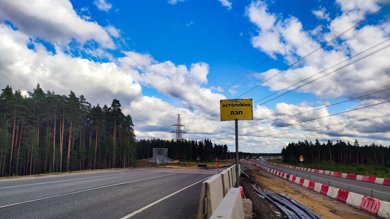 На изображении запечатлён дорожный знак «Осторожно ЛЭП», установленный у трассы, рядом со строительной площадкой. На заднем плане видны линии электропередачи, опоры и часть металлической конструкции, уложенной на землю. Снимок можно использовать в материалах о безопасности дорожного движения и энергетической инфраструктуре.