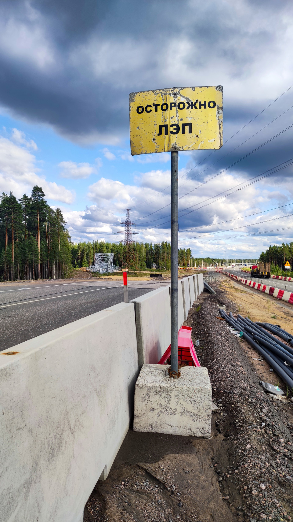 На изображении показан предупреждающий дорожный знак с надписью «Осторожно, ЛЭП», установленный вдоль автодороги. Справа от дороги расположены временные барьеры и кабельные трубы, слева начинается лесной массив. На горизонте видны опоры высоковольтной линии электропередачи и конструкции, связанные со строительными работами. Фотография подходит для иллюстрации тематики дорожных предупреждений и энергетической инфраструктуры.