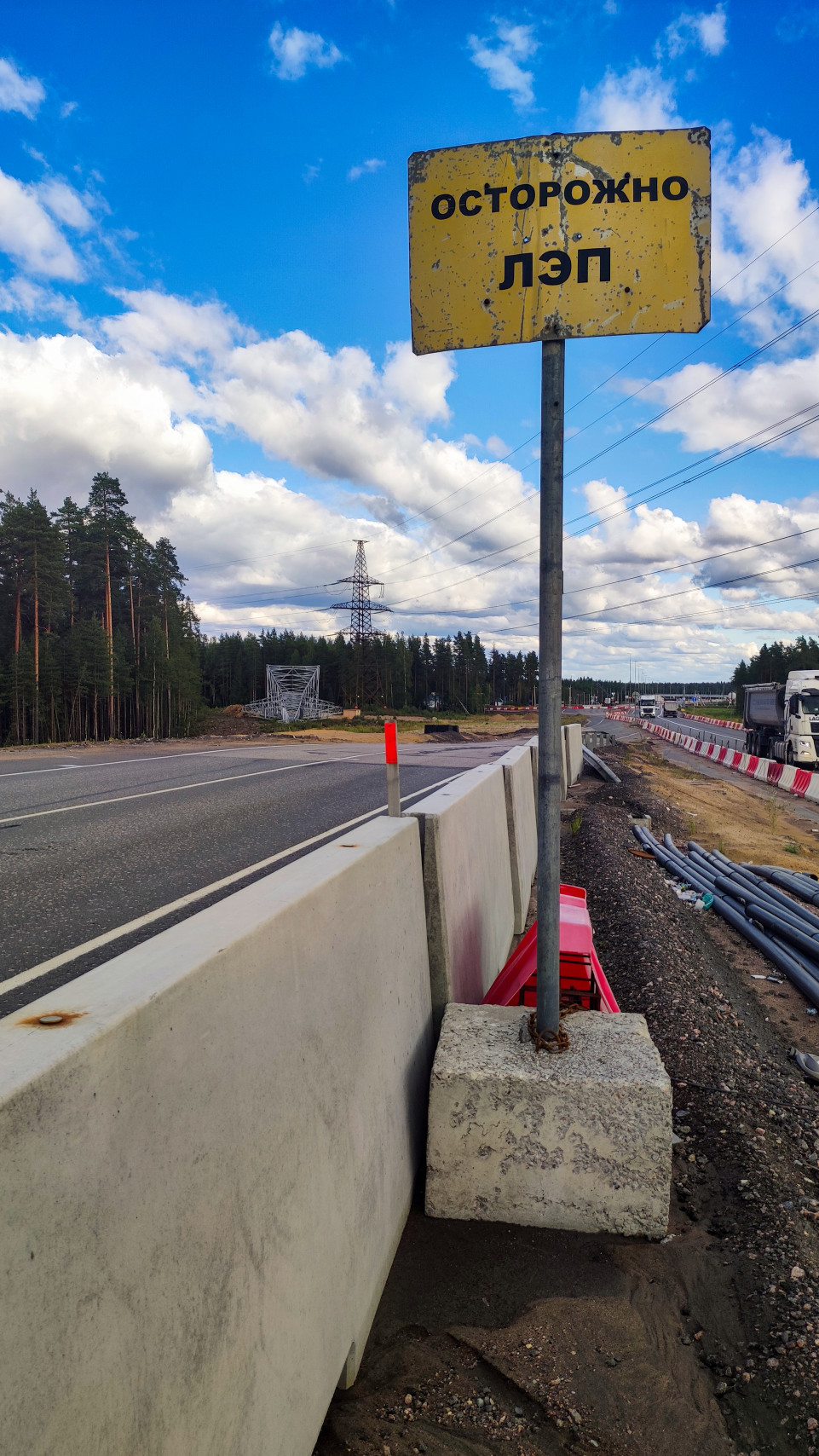 На изображении показан предупреждающий дорожный знак «Осторожно ЛЭП», установленный рядом с трассой и строительной площадкой. На заднем плане заметны металлические опоры и новая конструкция опоры ЛЭП, уложенная на землю. Снимок фиксирует важность мер безопасности при строительстве и эксплуатации энергетических объектов.
