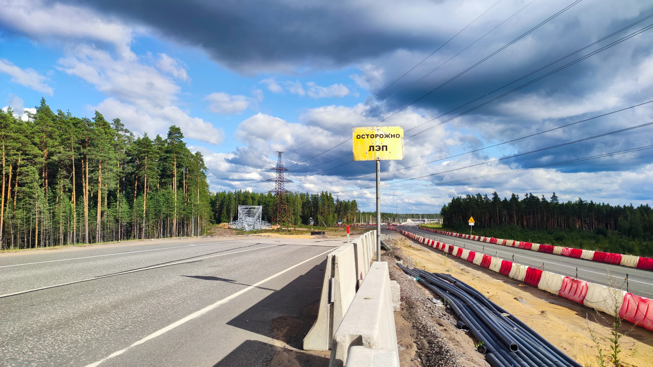 На фотографии изображен участок автомобильной дороги с предупреждающим знаком «Осторожно, ЛЭП» на желтом фоне. Знак установлен рядом с временными барьерами вдоль трассы. На заднем плане видны лесной массив, металлические опоры высоковольтной линии и элементы строительства. Кадр передает особенности дорожной инфраструктуры вблизи объектов энергетики. Может использоваться в иллюстрациях по теме безопасности на дорогах и энергетической инфраструктуры.