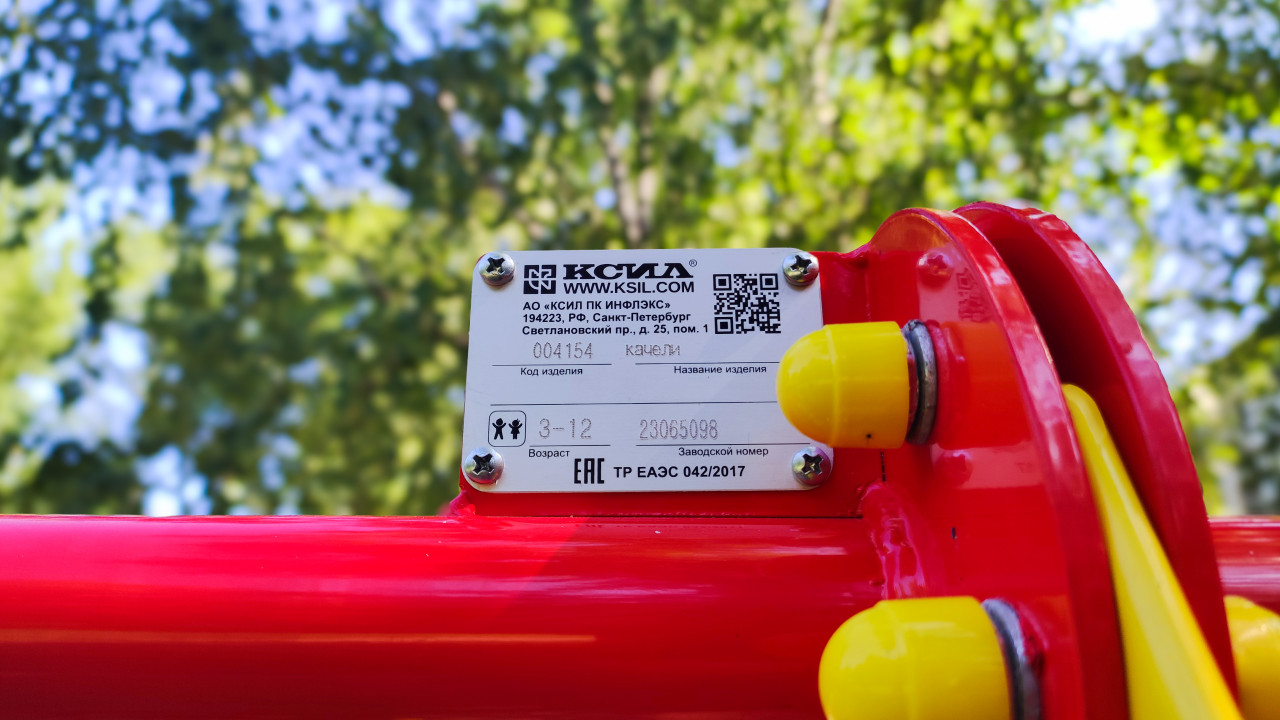 табличка паспорт изделия качели КСИЛ сертификация заводской номер табличка производителя монтаж оборудования контроль качества сертификат ЕАЭС детская площадка возрастное ограничение металлическая опора оборудование для детей изготовитель заводская табличка установка качелей производитель Санкт Петербург нормативы безопасности сертификация продукции контроль монтажа оборудование во дворе паспорт оборудования заводской номер изделия маркировка правила эксплуатации монтаж детской площадки табличка с даннымиПохожие фотографии
