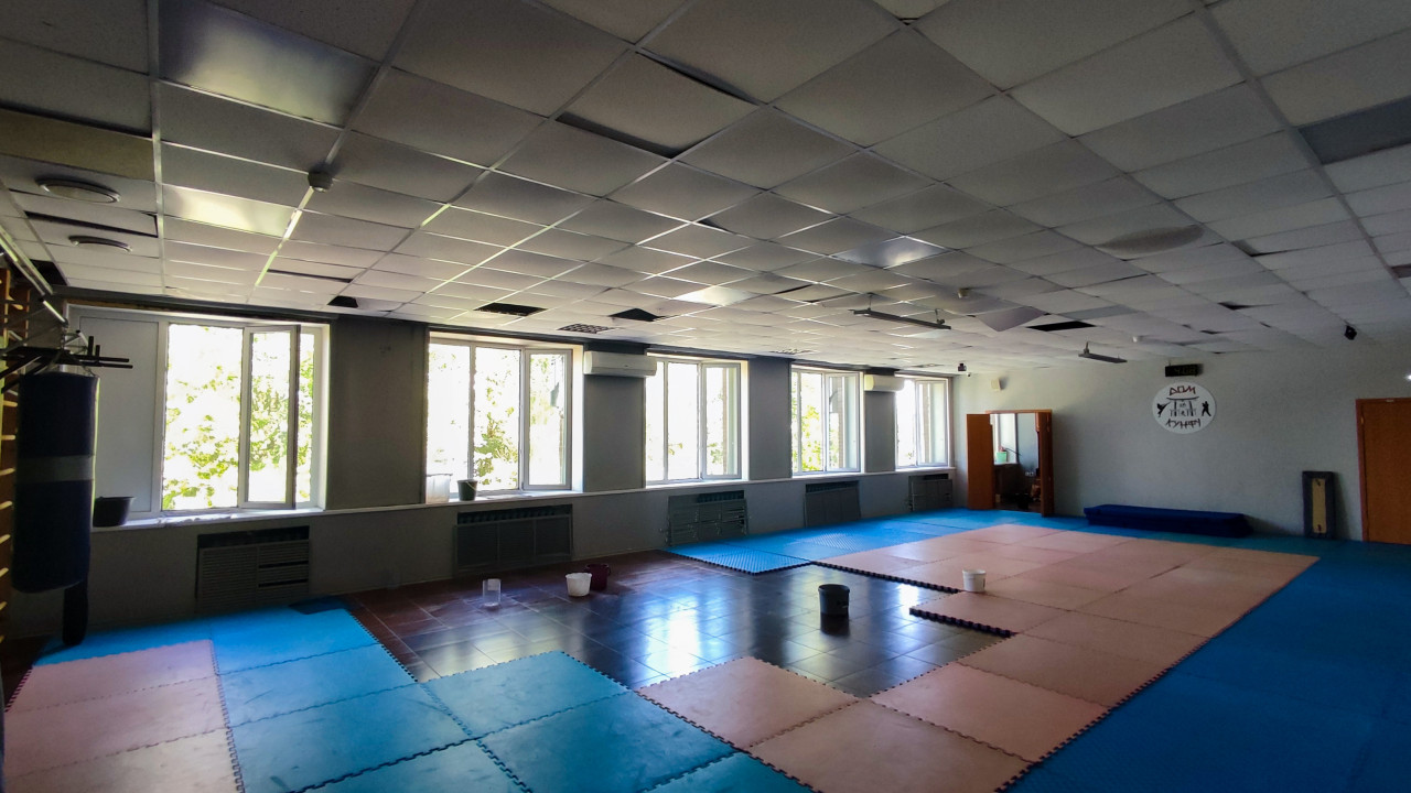 На фотографии изображен большой спортивный зал с подвесным потолком, часть плит которого повреждена или отсутствует. На полу уложены маты из модульных ковриков, предназначенные для занятий единоборствами или фитнесом. Вдоль стен расположены окна с кондиционерами и радиаторами, а на полу стоят ведра для сбора воды из-за протечек. В помещении также заметен боксерский мешок и гимнастическая шведская стенка. Снимок можно использовать в материалах о состоянии спортивных объектов, ремонте и эксплуатации зданий.