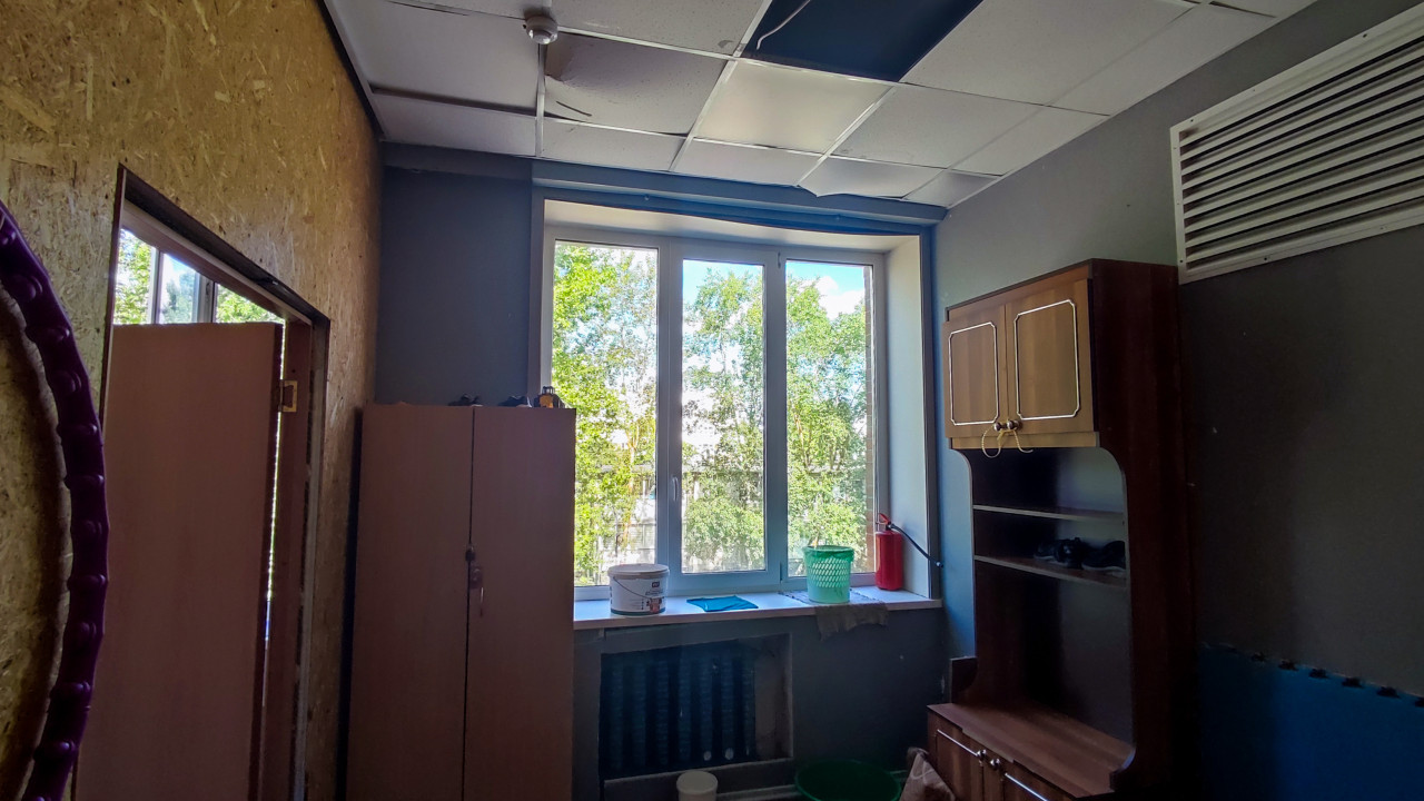На фото запечатлен небольшой кабинет с окном, в котором видны зеленые деревья на улице. Потолок выполнен из подвесных панелей, часть которых повреждена влагой, прогнулась или выпала. В комнате размещены шкафы, полка и мебель для хранения. На подоконнике стоят пластиковые емкости, а внизу заметны следы протечек и ведро. Изображение может использоваться в материалах о ремонте офисных и общественных помещений, последствиях аварий и неисправностей в зданиях.