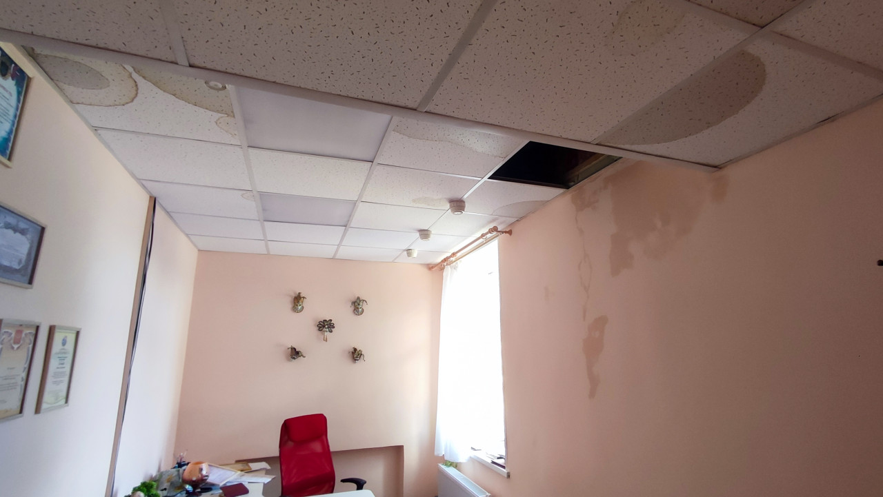 Офисное помещение с протекающим потолком и пятнами влаги