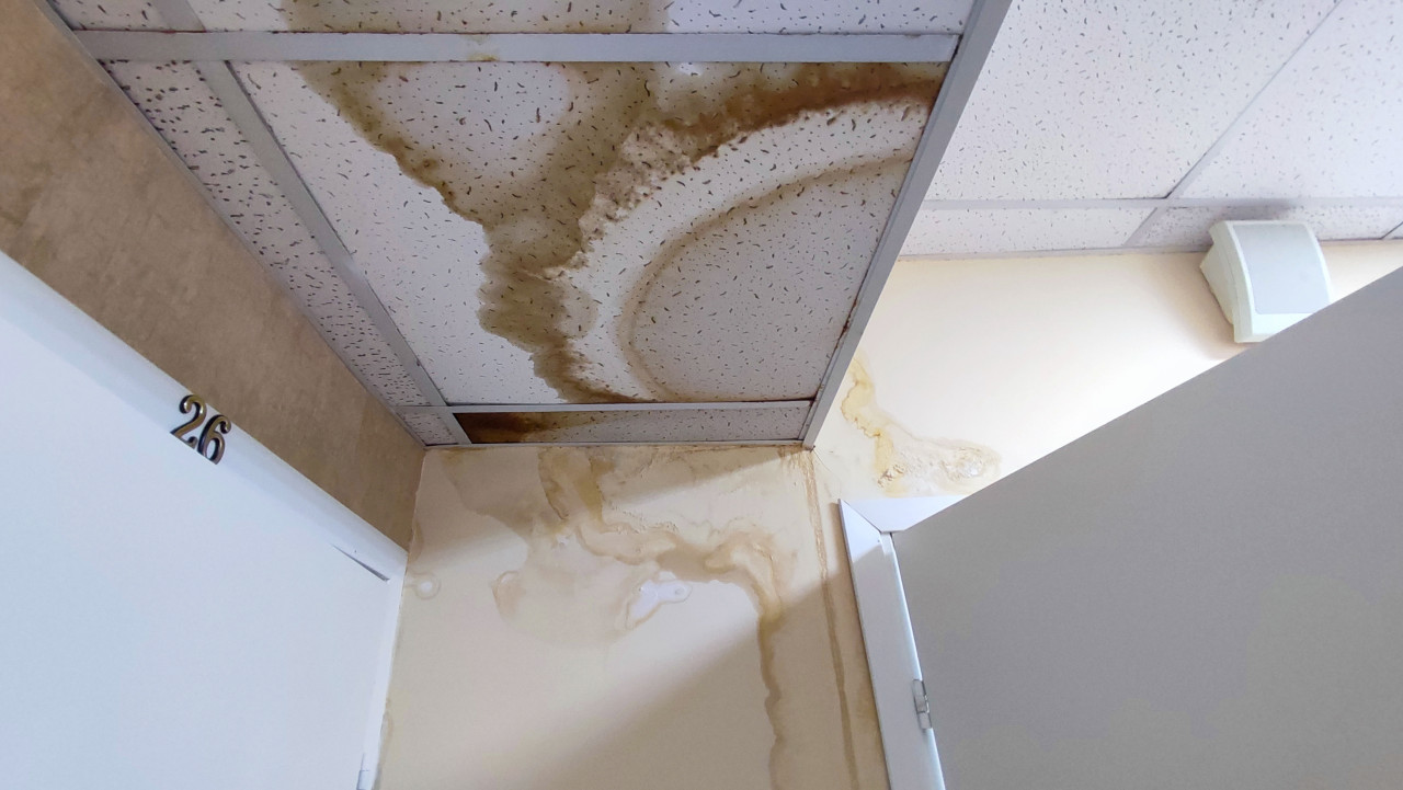 потолок протечка вода повреждения авария неисправность ремонт интерьер помещение аварийное состояние последствия дефекты затопление подвесные панели крыша стены потеки эксплуатация зданий общественное помещение протекание воды дефекты потолка ремонт помещений здание протечки крыши влажность аварийная ситуация эксплуатация помещений ремонт потолка крыша здания инженерные системы номер комнаты общественное здание аварийные последствия эксплуатацияПохожие фотографии