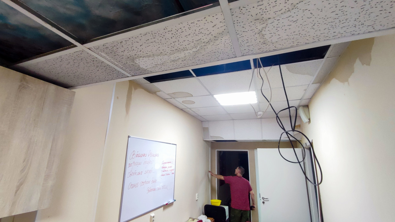 На фото запечатлен коридор с подвесным потолком, в котором часть панелей повреждена влагой, прогнулась или отсутствует. Видны потеки на стенах, свисающие кабели и открытые ячейки потолка. На стене установлена белая доска для записей с текстом. В помещении находится мужчина в полосатой футболке, осматривающий повреждения. Снимок отражает последствия протечек и аварийного состояния здания, что может использоваться в публикациях о ремонте и техническом обслуживании.