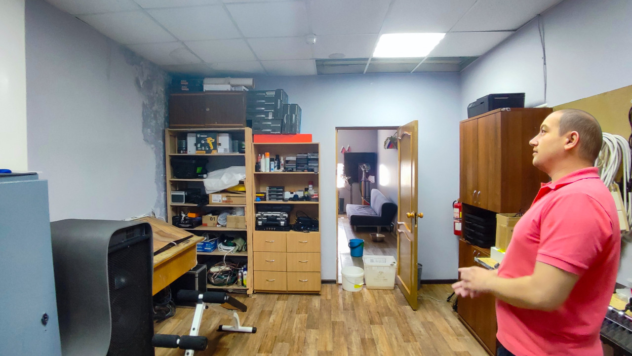 На фото показано техническое помещение с многочисленными стеллажами и оборудованием, часть потолочных панелей подвесной системы отсутствует или повреждена. На стенах заметны следы влаги, в помещении находятся человек и различное оборудование: кабели, коробки и техника. Снимок фиксирует эксплуатацию служебных помещений и может быть использован в материалах о ремонте и состоянии инженерных систем.