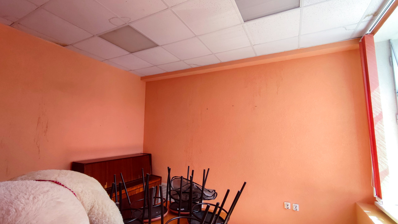потолок протечка вода повреждения авария неисправность ремонт интерьер помещение аварийное состояние последствия дефекты затопление класс учебное помещение подвесной потолок потолочные панели пятна влаги последствия аварии учебный класс перевернутые стулья столы оранжевые стены пианино поврежденный потолок дефекты здания последствия протечки потолочные дефекты учебное заведение потолок с разводами последствия затопления ремонт потолкаПохожие фотографии