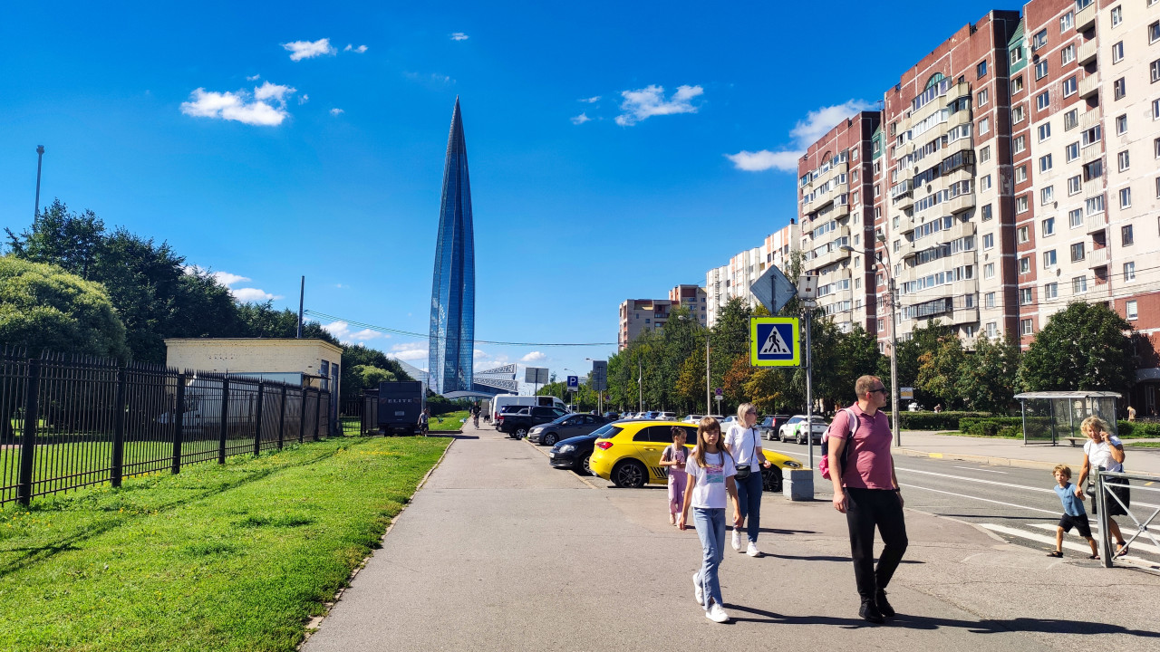 На снимке изображен жилой квартал с многоэтажными домами и пешеходами, а на заднем плане выделяется башня «Лахта Центр» — самое высокое здание России и Европы, построенное в 2012–2019 годах. На переднем плане видны припаркованные автомобили и люди, переходящие дорогу. Слева расположен забор с металлическими прутьями, справа жилые дома с балконами. Сцена отражает повседневную городскую жизнь и архитектурный контраст между современным небоскребом и советской жилой застройкой.