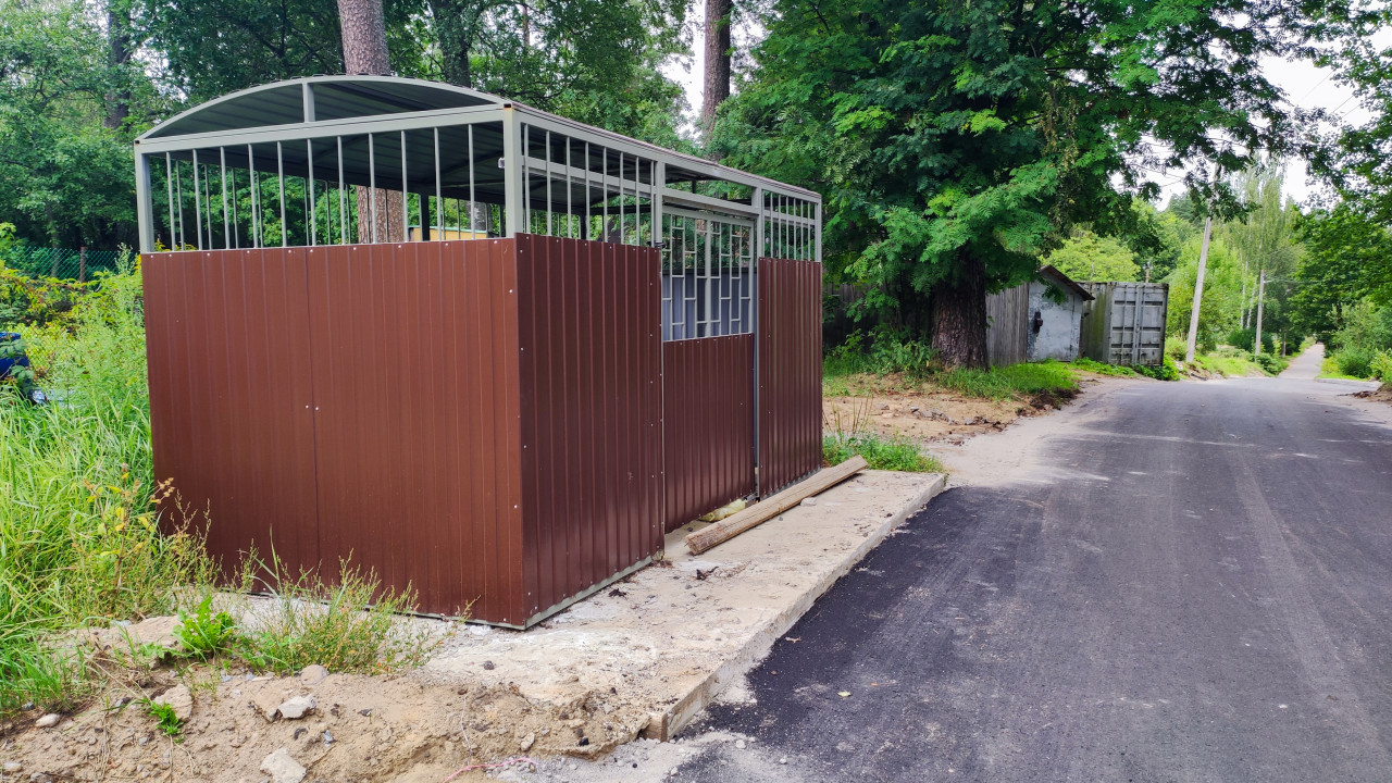 Фотография демонстрирует новую контейнерную площадку для сбора твердых бытовых отходов, установленную вдоль асфальтированной дороги. Конструкция выполнена из металла и облицована профнастилом, имеет крышу и боковые ограждения. Рядом виден частный сектор с ограждениями и зелеными насаждениями. Такое сооружение предназначено для благоустройства территории и организации вывоза мусора.