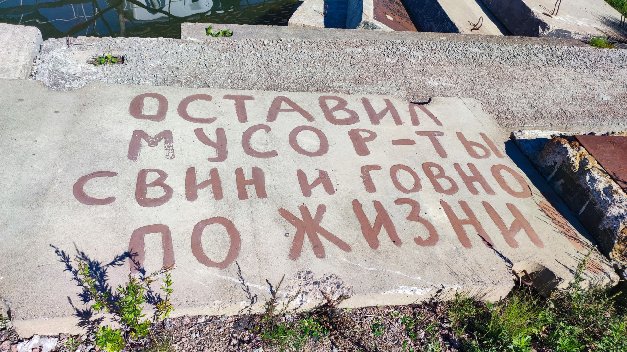На фотографии изображена надпись коричневой краской на бетонной плите: «Оставил мусор — ты свин и говно по жизни». Плита расположена у кромки воды, рядом заметны следы ржавчины и растущая трава. Фото фиксирует пример неформального уличного послания, связанного с экологией и культурой поведения. Может использоваться в материалах об экологии, общественных инициативах и визуальной культуре.
