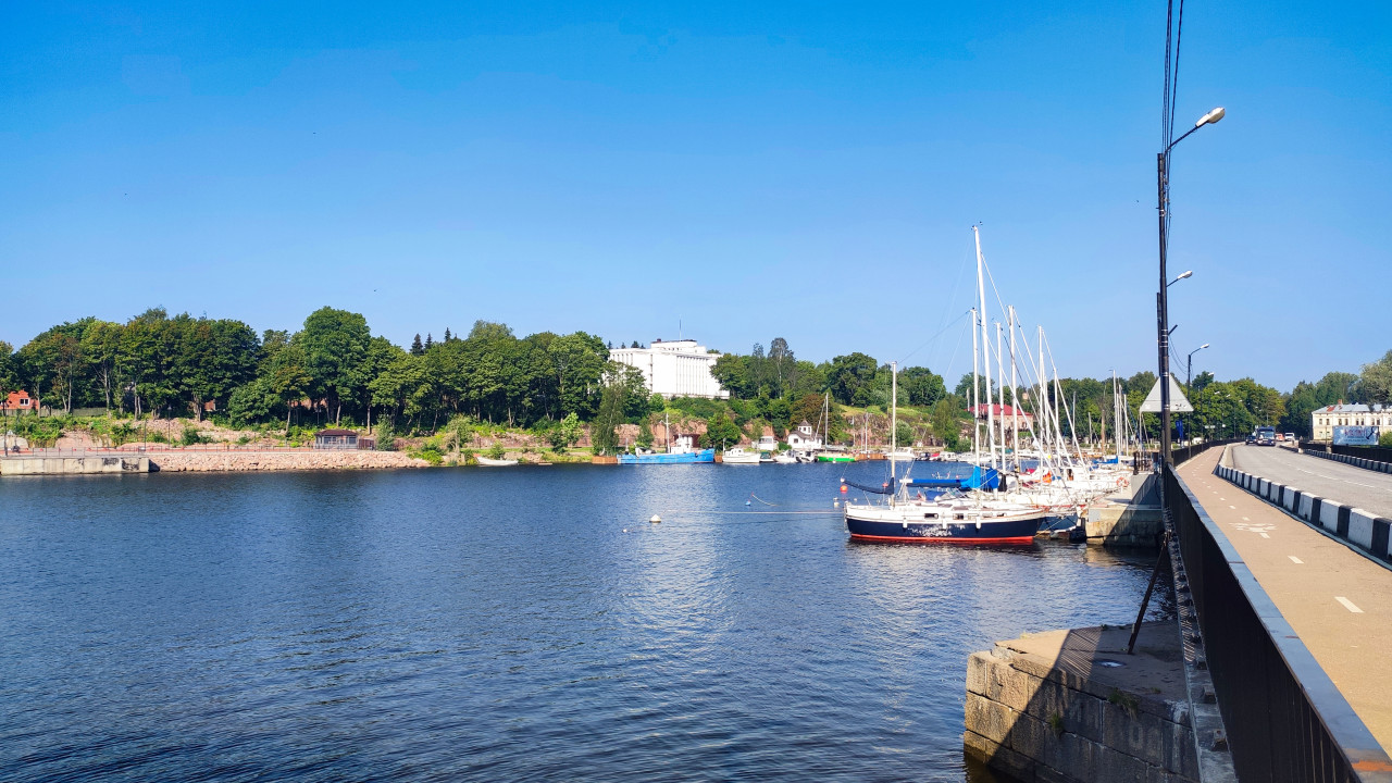 На фотографии изображён вид на акваторию с пришвартованными яхтами и парусными судами. На переднем плане заметен фрагмент моста с пешеходной дорожкой и ограждением. На противоположном берегу расположены здания, среди которых выделяется белое сооружение на возвышенности, окружённое зелёными деревьями. Вдоль берега стоят малые суда и катера. Ясная погода и голубое небо создают условия для съёмки днём. Снимок фиксирует элементы городской набережной и инфраструктуры для маломерных судов.