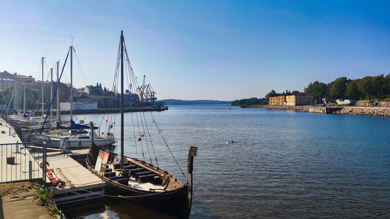 На фото запечатлена набережная в городе Выборг, где у понтона пришвартованы современные яхты и лодки, а также реконструированный деревянный корабль викингов — ладья с высоким носом, украшенным резным орнаментом. На заднем плане видны портовые краны и промышленные здания, относящиеся к современному Выборгскому морскому порту. Слева в кадре различимы городские строения, а справа — длинное желтое каменное здание XIX века на берегу. Снимок отражает сочетание исторической реконструкции и современной инфраструктуры. Может использоваться в материалах о Выборге, истории Балтийского региона и морской культуре.