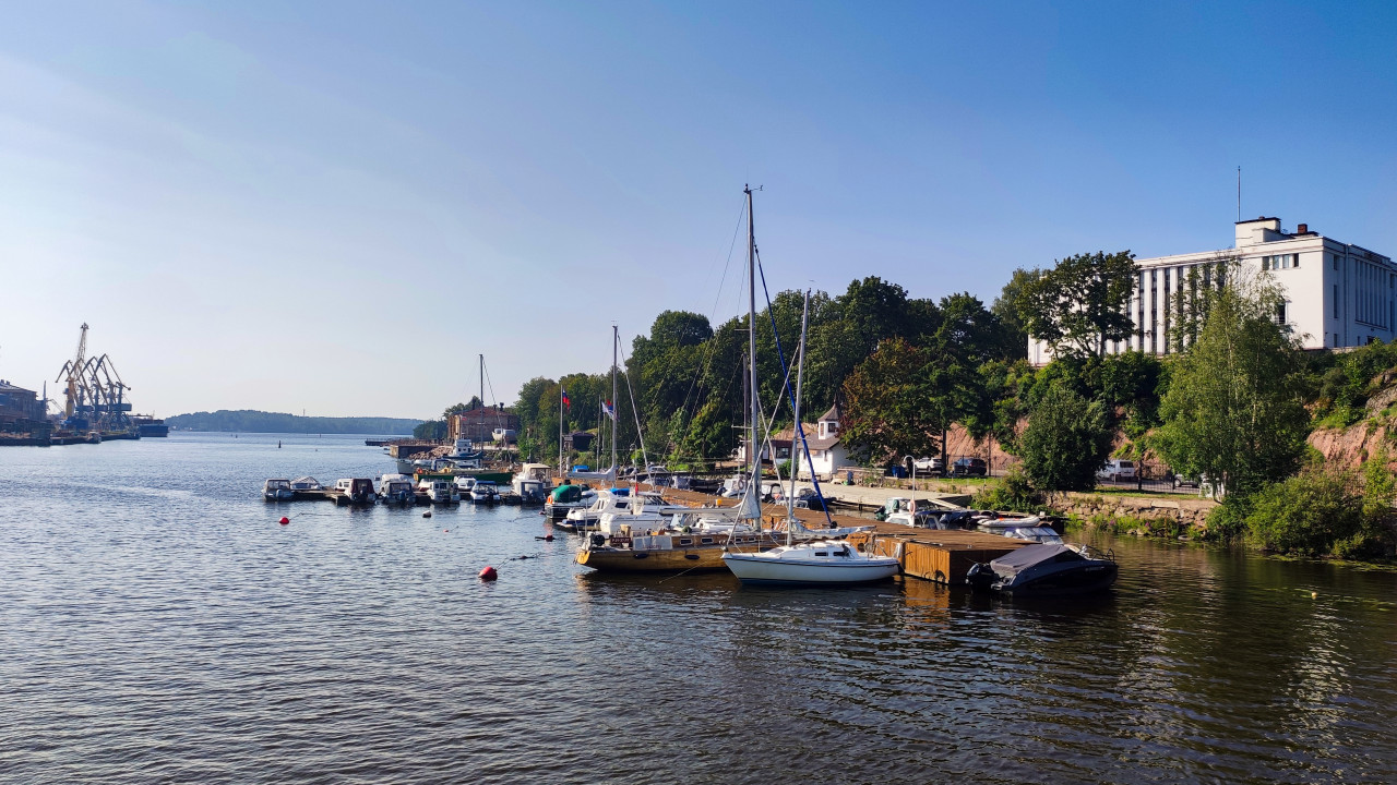 На фото изображена часть Выборгской бухты с пришвартованными яхтами и лодками у понтона. На правом берегу возвышается белое здание советского периода, расположенное на холме среди деревьев. На горизонте видны портовые краны и индустриальные объекты. Вода занимает большую часть кадра, создавая ощущение открытого пространства. Снимок фиксирует сочетание архитектуры XX века, современной морской инфраструктуры и промышленного пейзажа города.