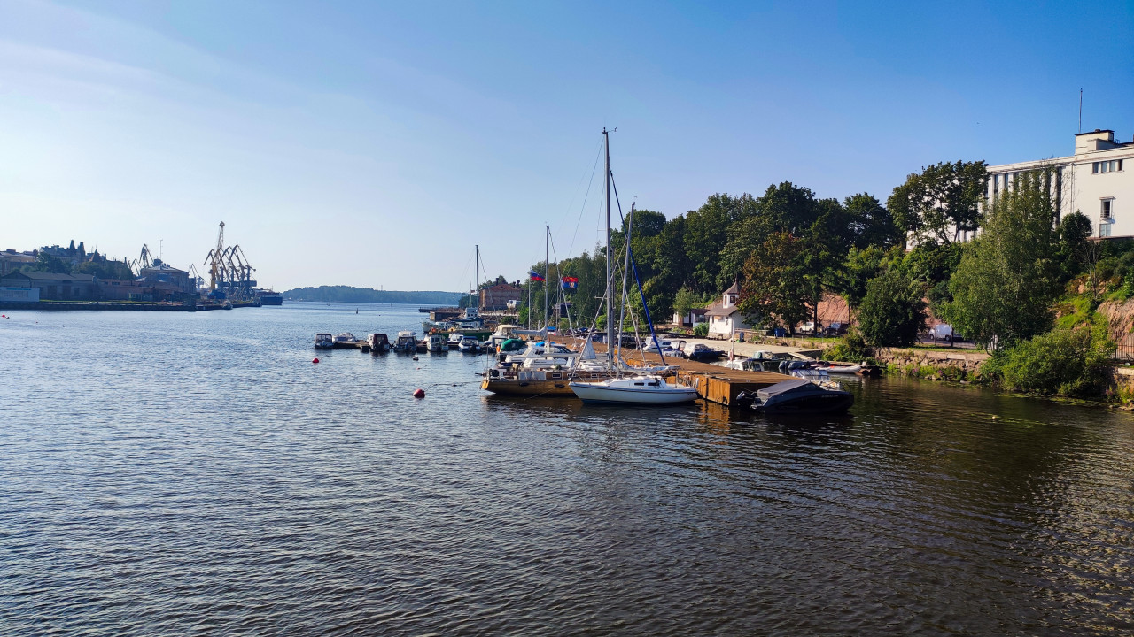 Фотография запечатлела участок Выборгской бухты с пришвартованными яхтами у понтона. На правой стороне кадра расположено белое здание на холме, относящееся к архитектуре XX века. На горизонте видны портовые краны и городские строения. Вода занимает большую часть снимка, создавая ощущение открытого пространства. Кадр может использоваться в материалах о туризме, архитектуре и судоходстве Ленинградской области.
