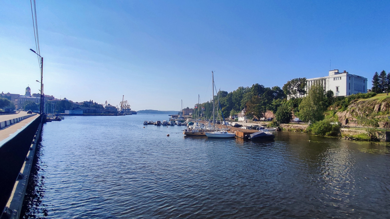На фотографии зафиксирован участок набережной в Выборге. На переднем плане расположены яхты и лодки у понтона, а на заднем — белое здание в стиле модернизма, стоящее на возвышенности среди деревьев. Вдали, ближе к горизонту, можно рассмотреть портовые краны и часть промышленной зоны города. Кадр демонстрирует совмещение архитектуры, природного пейзажа и современной морской инфраструктуры. Снимок подходит для публикаций о туризме, судоходстве и архитектуре Северо-Западной России.