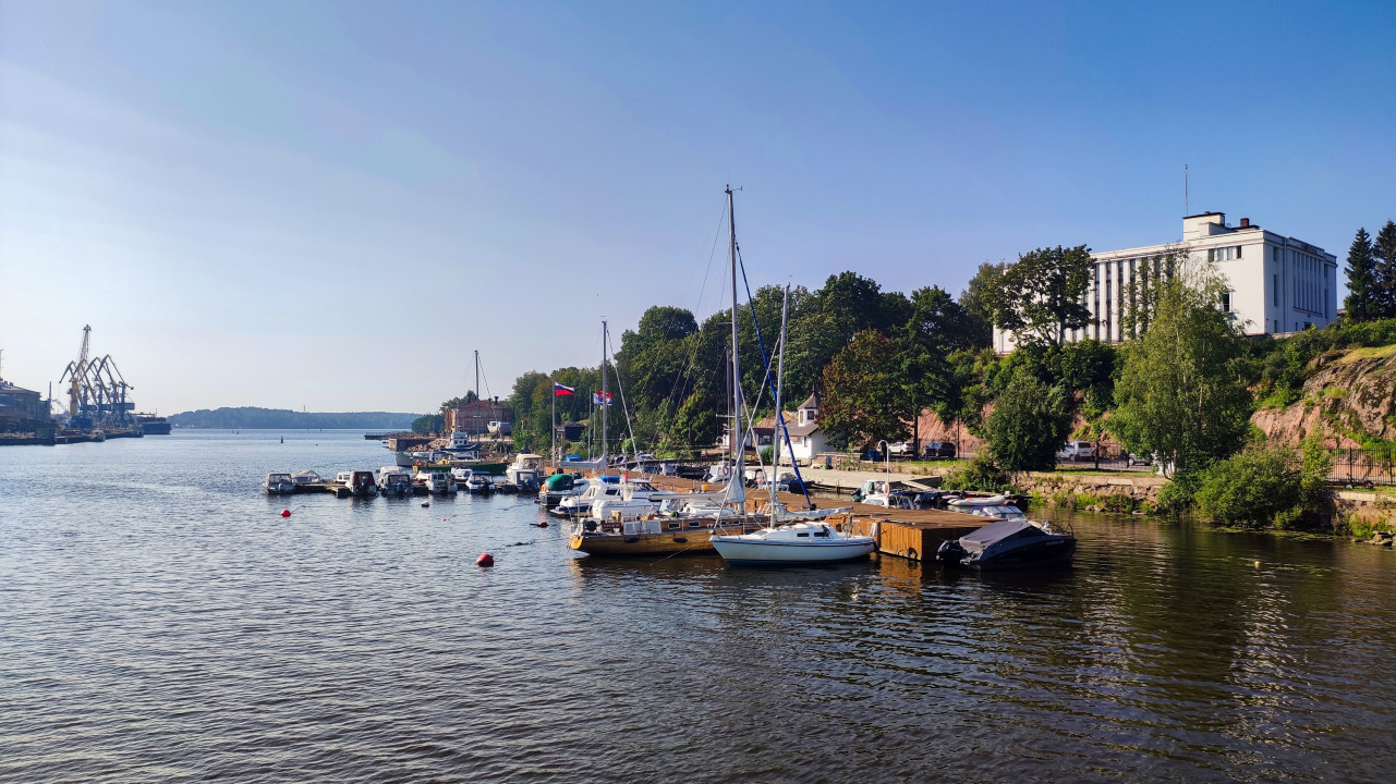 На снимке показаны пришвартованные у понтона яхты и моторные лодки в Выборге. На правом берегу возвышается белое модернистское здание советской эпохи, окружённое зелёными насаждениями. На горизонте видны портовые краны, формирующие силуэт промышленной зоны. Кадр отражает соседство рекреационной зоны и индустриальной инфраструктуры города. Фотография может быть использована в материалах о туризме, судоходстве и архитектуре Северо-Запада России.