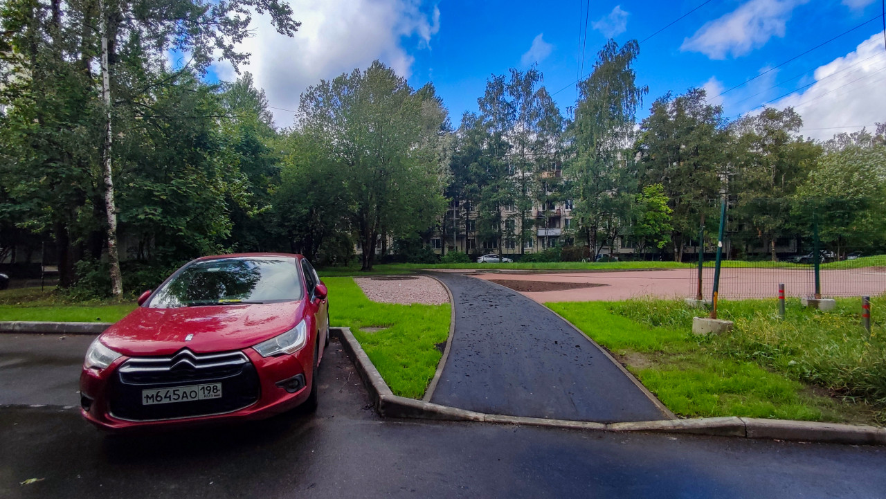 Фотография показывает участок дворовой территории, где заасфальтирована новая дорожка с выходом к жилому дому. На переднем плане — красный автомобиль, рядом расположена парковка. На заднем плане видны многоэтажные дома советского периода и деревья. Кадр отражает процесс благоустройства дворов и модернизации городской среды.
