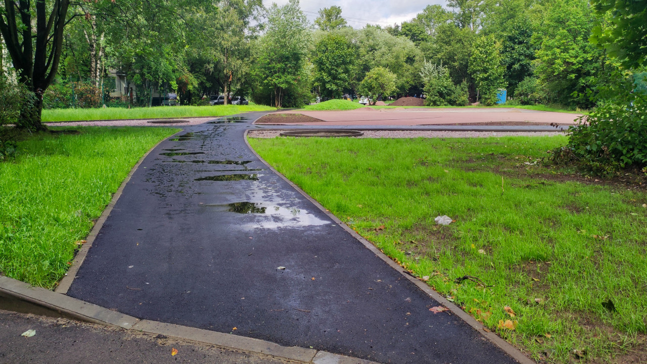 На фото изображён участок дворовой территории, где проходит новая асфальтированная дорожка, ведущая к спортивной площадке с красным покрытием. На дорожке видны следы дождя и лужи. Слева и справа её окружают зелёные газоны и деревья. На заднем плане заметны припаркованные автомобили и городская застройка. Снимок фиксирует благоустройство дворовой территории и развитие городской инфраструктуры.